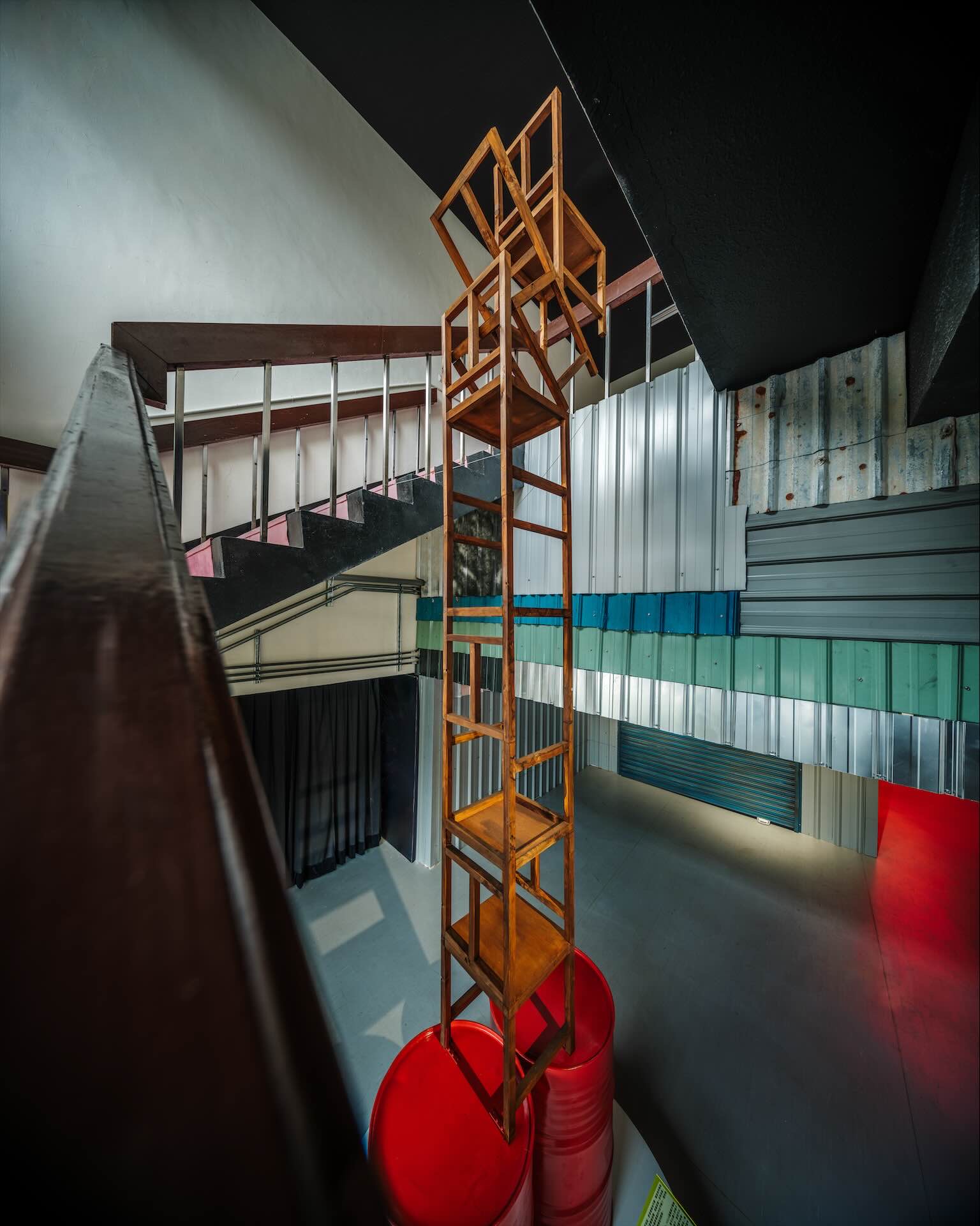文博會主題館「野性博物館」入口大廳的首件裝置,是以FOCA福爾摩沙馬戲團的疊椅子裝置。從平地搭起高臺,揭示展場外巨大馬戲棚空間亮點的內核與重心。(2023臺灣文博會提供)