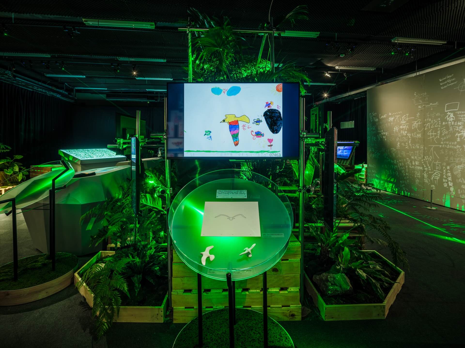 「野性博物館」第二展間「裝配彈藥庫」中、經過豪華朗機工花費兩年時間上山下海的校園旅程與收集完成的《天氣好不好 我們都要飛》(2009)小朋友手稿與動畫。透過一隻由張耿豪製作的手工模型鳥,經由電腦3D影像程式運算後, 製成37,200張編號空白鳥圖紙,再由臺灣各地小學37,200位作畫的小朋友進行創作,再把圖一張張掃描到電腦裡面,最後把這些美麗的鳥變成動畫。(2023臺灣文博會提供)