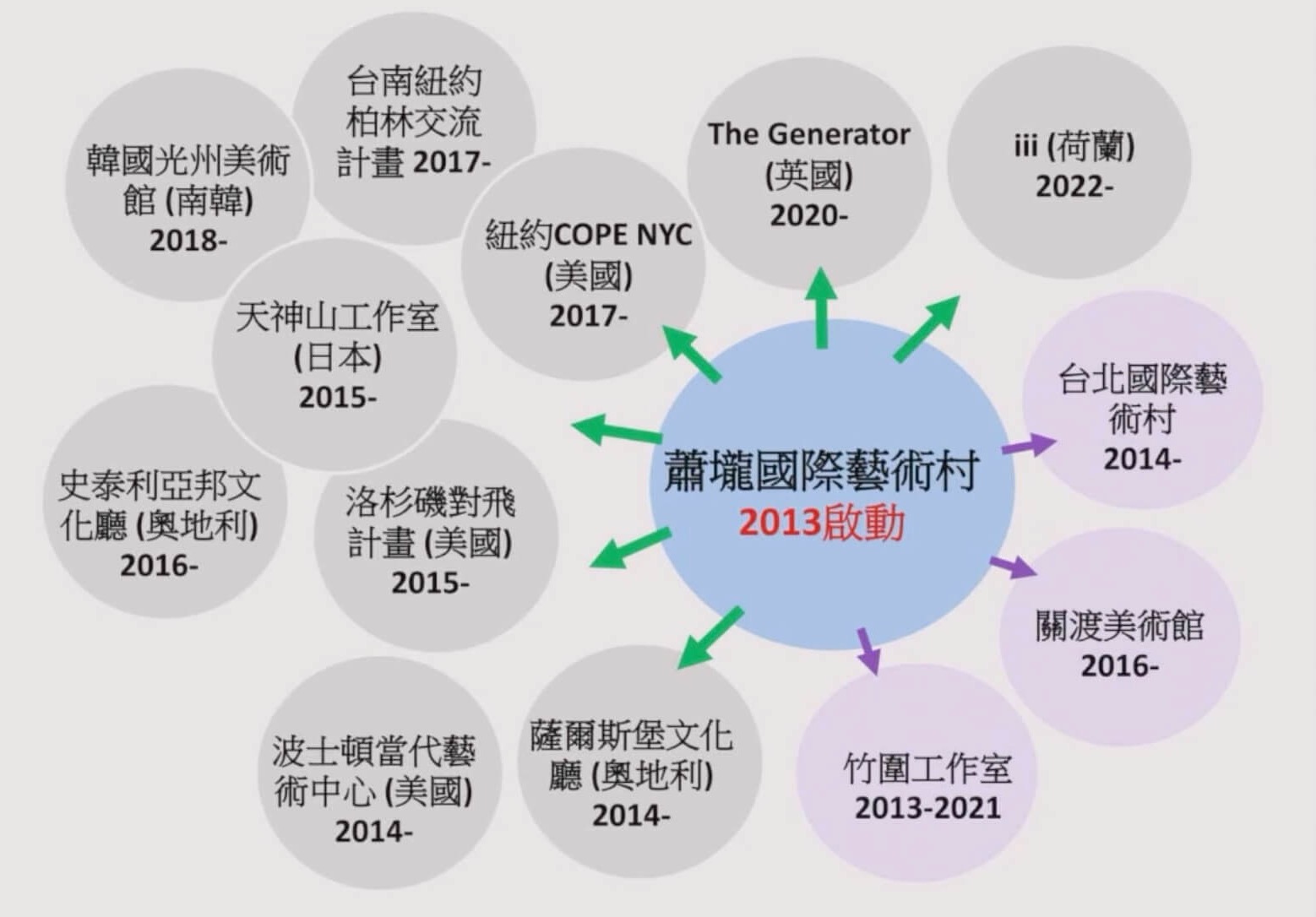 延續謝仕淵對蕭壠文化園區的歷史背景介紹,現為蕭壠國際藝術村策展人暨國立成功大學創意產業設計研究所副教授的陳明惠,深入梳理蕭壠國際藝術村成立至今的發展。蕭壠國際藝術村於2013年成立,駐村計畫透過每年的公開徵選(Open Call)、友好機構選薦,以及不定期與臺南新藝獎合作,提供駐村保障名額等方式進行,迄今已累積來自世界各地26個國家、約150位藝術家參與。蕭壠國際藝術村成立不久,便積極尋求與國際機構的交流可能,期間陸續與奧地利薩爾斯堡文化廳(2014-)、美國紐約「COPE NYC」(2017-)以及南韓光州市立美術館(2018-)等機構建立合作關係,每年互相薦送藝術家前往當地駐村創作,逐漸搭建起多元的國際交流網絡。
