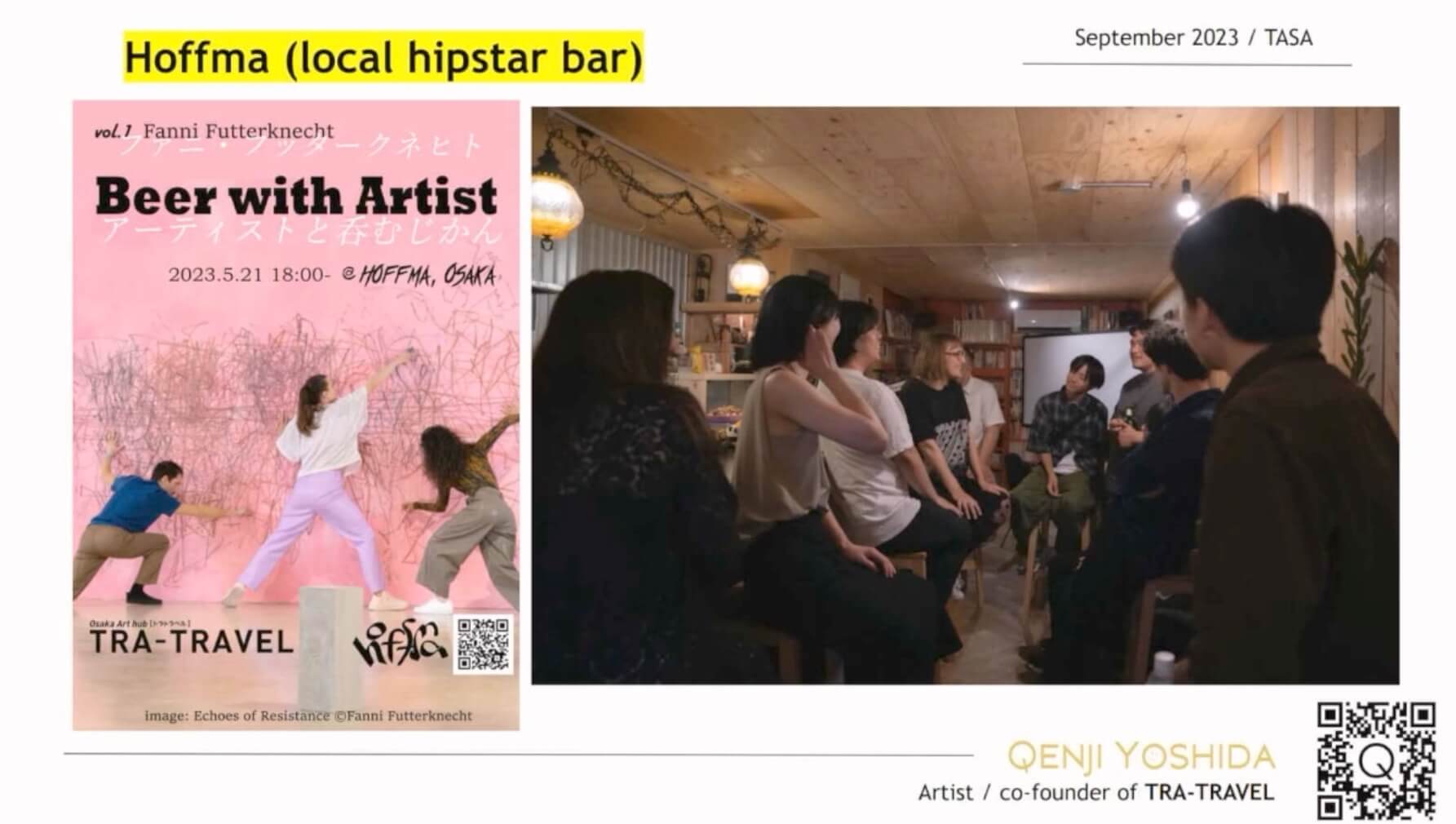 來自日本大阪的藝術家Qenji Yoshida曾於2018年到臺北寶藏巖國際藝術村駐村,並參與了當年的TASA年會,回到日本後也參加了京都的RA年會。Qenji表示,這兩場活動分享的許多藝術進駐組織與實踐案例,啟發了他創立藝術交流組織「TRA-TRAVEL」(簡稱TRA),並決定採取不需要擁有實體空間,而是透過與不同單位建立友好關係、借用空間的運作模式。