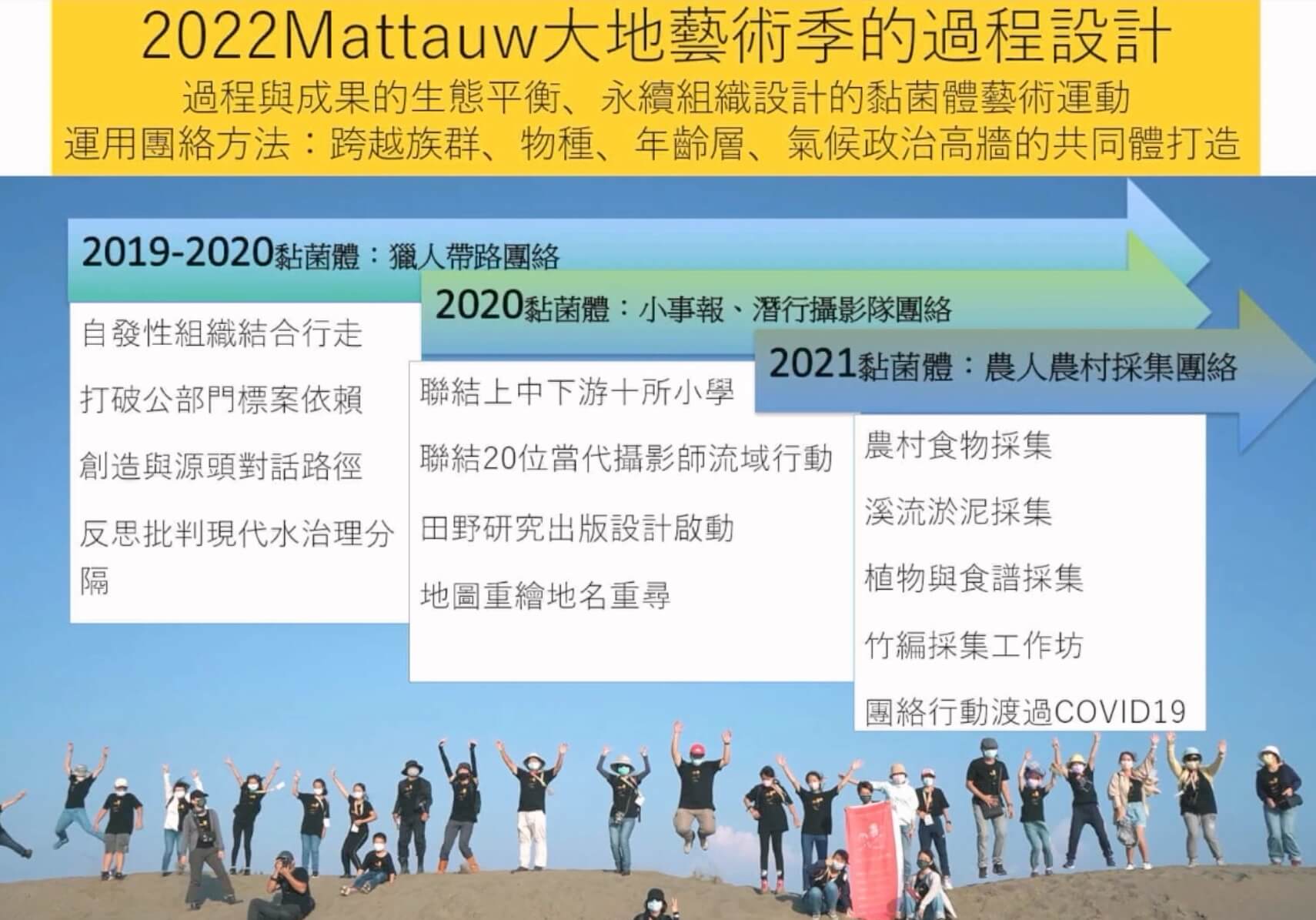 國立臺南藝術大學藝術創作理論研究所教授龔卓軍,以「2022Mattauw大地藝術季」的策展工作方法進行分享。他提出面對危機的時候,機構常常是無力的,需要聽從國家的命令,因此大地藝術季的團隊,以非機構式的「meshwork」(團絡)與「slime mold」(黏菌體)兩大關鍵所組成。