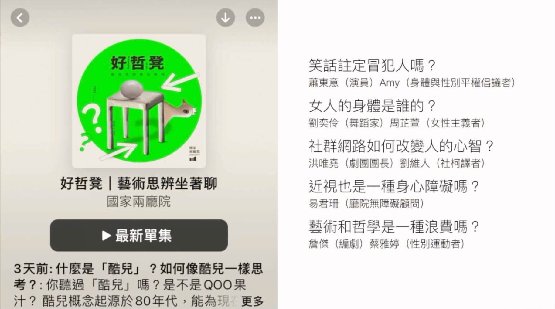 作家朱家安自2021年起受兩廳院委託製作Podcast節目《好哲凳》,向大眾推廣藝術與哲學。節目的選題可以分成兩個面向,第一種是與藝術和哲學相關、基礎且通用的命題;第二種則是跟具體特定的藝術類型/議題有關,朱家安以「近視也是一種身心障礙嗎?」單集為例,提出眼鏡明顯是人類的輔具,但現代社會不會把近視當作一種身心障礙,這背後可能與人類天生的本質能力,以及現代社會的面貌有關。不過現代人忙於生活,可能沒有餘裕去思考這樣的議題,因此《好哲凳》試圖透過選題去激發聽眾思考,並從中發現哲學與藝術之間的共通點——引導人們看向社會不鼓勵你去看的地方,鼓勵人們去思考、嘗試各種未知的事,看見生活中更多的可能性。