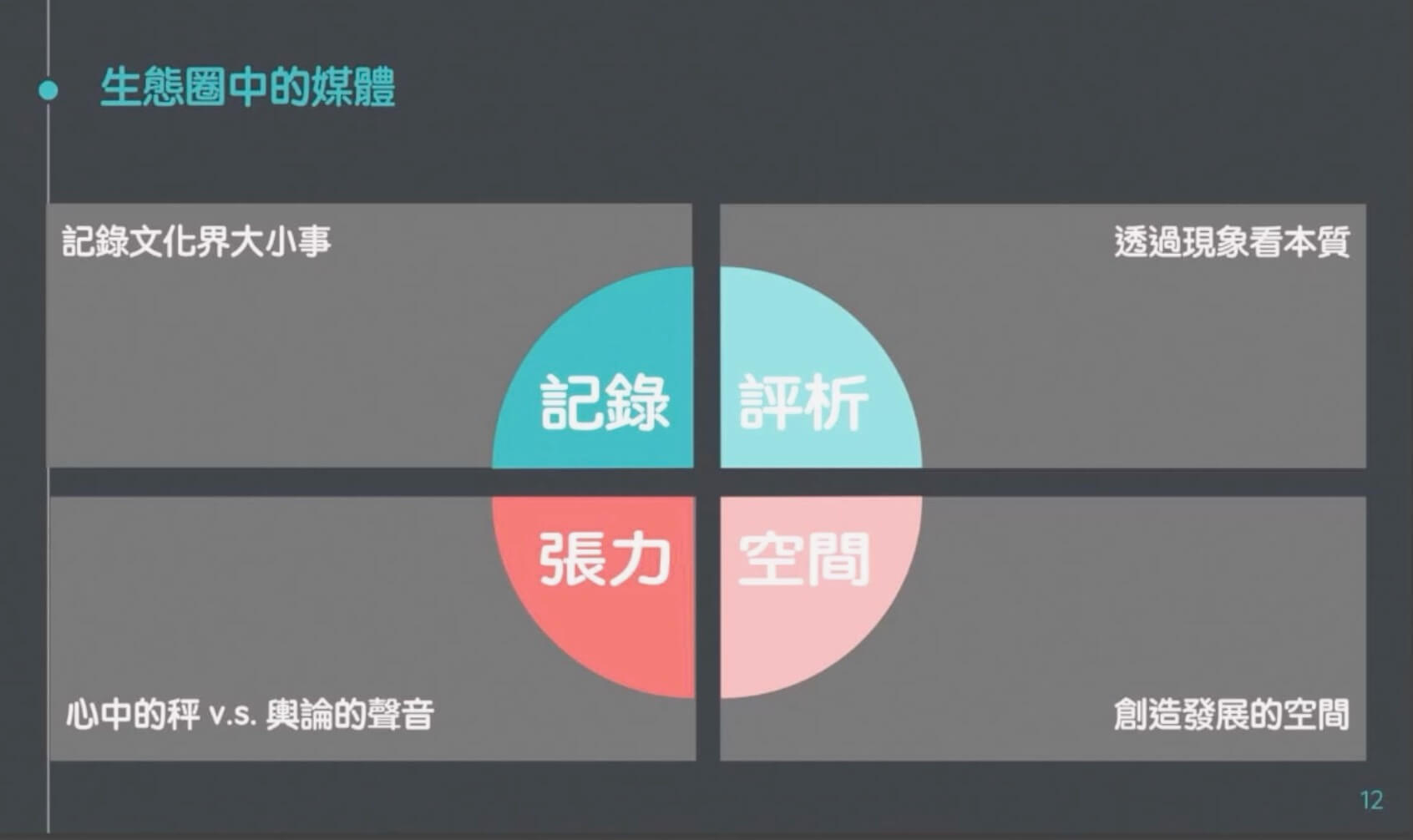 藝術媒體要能走得長遠,營收也是重要的一環。媒體的營收模式也反映出當時代的社會與產業變遷,傳統的媒體營收以單頁廣告、廣告文章產製為主,當代則逐漸發展出講求使用者體驗的功能與服務;內容載體也從傳統的分眾演變為當代的多聲部。在不斷轉型的同時,嚴瀟瀟認為媒體人應持續思考作為媒體的責任與義務,為媒體「祛魅化」,跳脫既定的價值觀取向,以跨越差異性的傾聽,促進跨界的協作,減少對立。