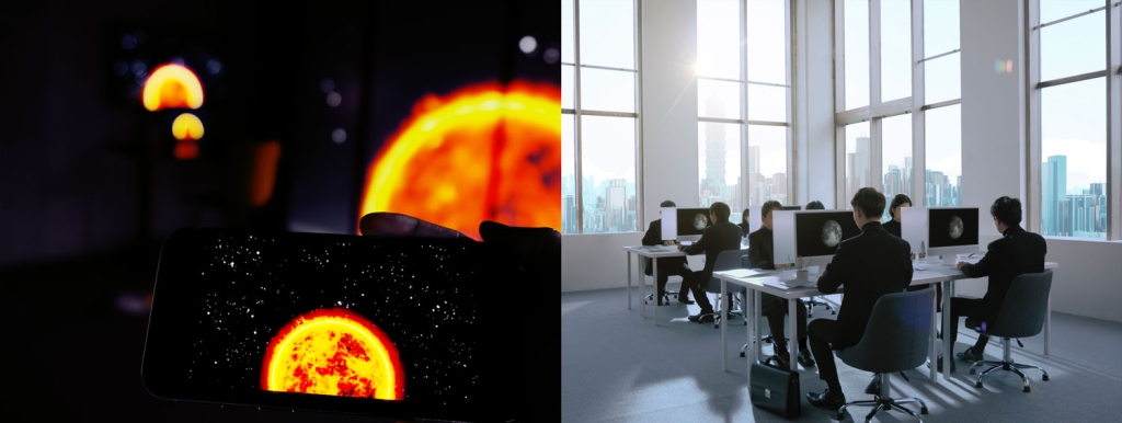 儘管,在陳姿尹與莊向峰的錄像《日出》那裡,「縫合」或許不在單一畫面之內組織,但雙畫面並置也讓敘事方式產生更有趣的發展。旁觀視角的辦公場域與主觀的臥室場景構成畫面的二分,以帶著表演性的幽閉感,明暗鋪陳的情境中有兩個日出,分別代表當代生活景況的工作時間與某種倦怠狀態,而劃分之兩邊亦能看作是對專注性之爭奪。右邊畫面的主觀視角偶有暗示主體觀看位置的眨眼效果,而同時出現在畫面中不同位置與不同時間的燃燒火球,串聯成人們身處於當代的這個或那個系統中屬於太陽時間的每日運作流程。