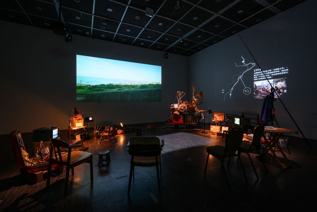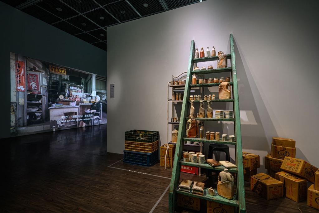 展覽的地景主題,很大程度地都是關於變遷、遺留物、事故,以及部分連繫著失去與創傷的歷史記憶。李珮瑜的《勝雄商行》是一則關於私人記憶與大環境變遷交會的見證。以物件換喻的燒陶翻模方式,加上訪談錄像,重現祖父母位於鹽埕建國市場的雜貨店場景與故事。《永福製品》是一個過程極為複雜且厚工的創作計畫;當李承亮與蔡咅璟把台南火車站旁的「幸福牌」老舊招牌拆下運到展場中,搭配透過多種管道蒐集而來由幸福牌產製的音響,並定時閃爍著七彩LED燈光播放著馮志銘創作的音樂聲響時,有著OOO哲學在談的「湧現現象」(emergence),大小各型音響與新編音樂的組合,創造新的氛圍與空間屬性,以整個大展廳為腔體,光、聲、物之喧嘩溢滿了作品關注的2009年金融海嘯議題。有中場休息也就不奇怪了。也可以說,這已不只是新聞考古,也是播放媒體考古、音樂共鳴的身體感考古,更是許多人的一段生命記憶考古。「石在工作隊」的《浪的遷徙者,與他們的紀念物》創作計畫,則是著眼於馬崗和龜山島同一個海洋文化生活圈的一群人的離散生命史。林奎妙、何睦芸與陳衍良等核心成員,透過邀請當地民眾參與的過程,共同打造象徵遷徙的流浪車;車上的負載品與物無巨細地羅列在展場中的物品,在人們回望性凝視的指認中,從經濟生活到自然地景,面對徵收、開發、觀光與環境變化,藉由作品計畫的聚集與交流,展望某種倡議對話的未來。