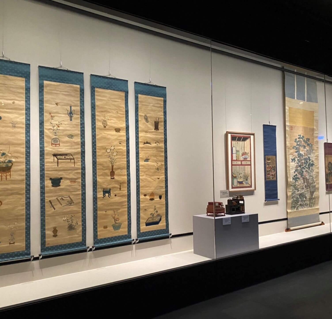 又蘇東坡與趙孟頫在朝鮮王朝文人之間地位十分崇高,喜愛蘇軾的文人經常聚集在一起舉辦類似今日大師冥誕紀念展的「壽蘇會」追慕文會;朝鮮宮廷也大量收藏趙孟頫的書跡,並刊刻後作為賞賜朝臣的禮物。另外,當時畫家還流行寫生「真景山水」,外出描繪周圍的風景,其中位於江原道的金剛山,因有上萬石鋒的壯闊景色而出名,最常被文人描繪,且四時景色各有特色,深受畫家喜愛。若我們將展場中的文房用具、花瓶、漆盒、漆桌、屏風、冊架圖等文物在腦中組合,便能輕鬆想像出當時貴族文士的居家書房布置情景。