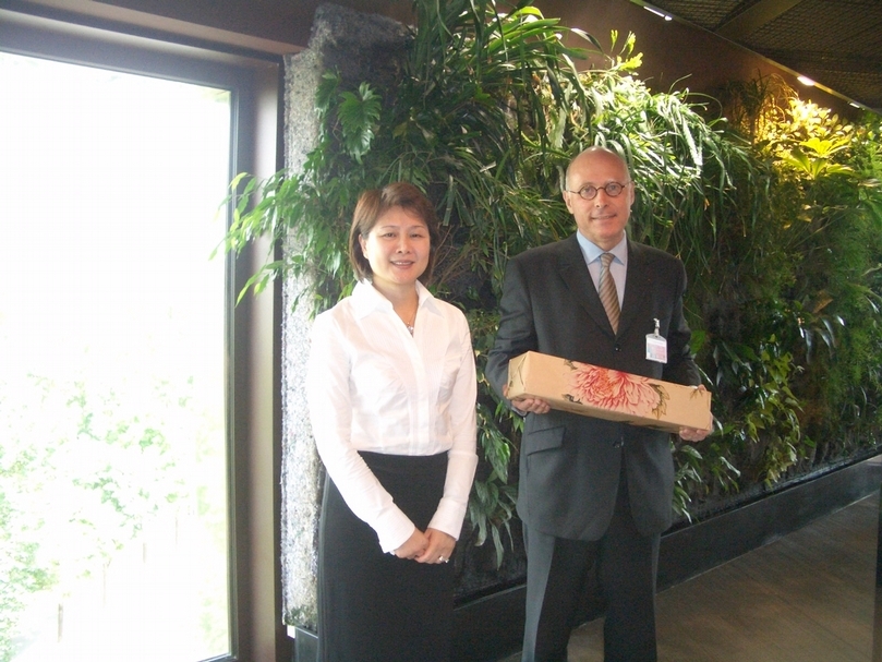 2012年11月,故宮馮明珠前院長於凱布朗利館拜會馬丁館長。左起:展覽、出版與發展處處長(Hélène Fulgence)、馮前院長、馬丁館長、時任凱布朗利館巡展負責人鍾志佳。(陸仲雁提供)