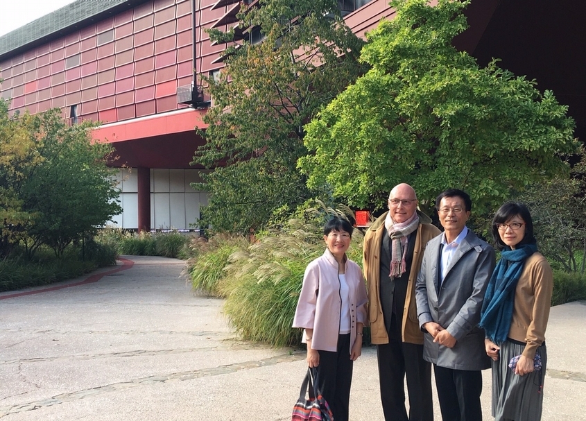 2016年10月,故宮前院長林正儀赴凱布朗利館參訪及拜會馬丁館長。右起:時任器物處余佩瑾處長(2020年元月升任副院長)、林正儀前院長、馬丁館長、筆者。(陸仲雁提供)