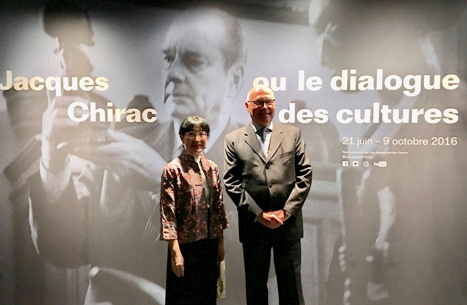 2016年6月,筆者受邀出席凱布朗利館十周年館慶,與馬丁館長合影於「賈克.席哈克——文化對話」特展展廳前。(陸仲雁提供)