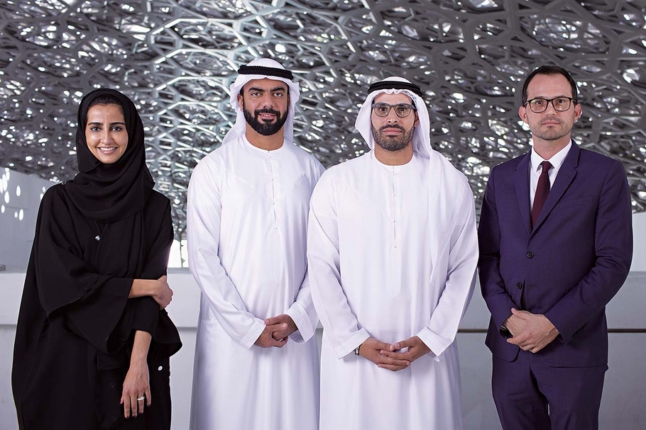 左至右為: 阿布達比盧浮宮的項目經理Hissa Al Dhaheri、UAE文化旅遊局長Saif Ghobash、HE文化和旅遊部主席Mohammed Al Mubarak與阿布達比羅浮宮館長Manuel Rabaté。© Louvre Abu Dhabi Mohamed Somji