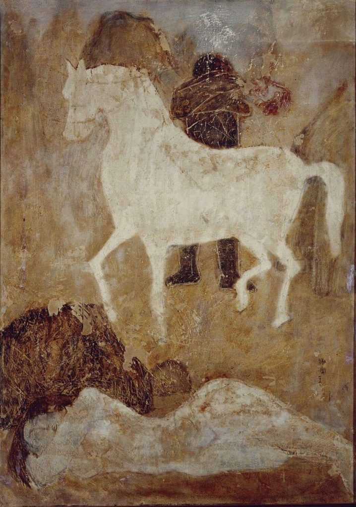 在早期作品中,因無法負擔昂貴油畫顏料,以油漆取代的打底,形成的紋路讓畫作充滿岩石般肌理,色彩上也因採用了價格較便宜的黑色與棕色,成就似古畫般的神祕調性。