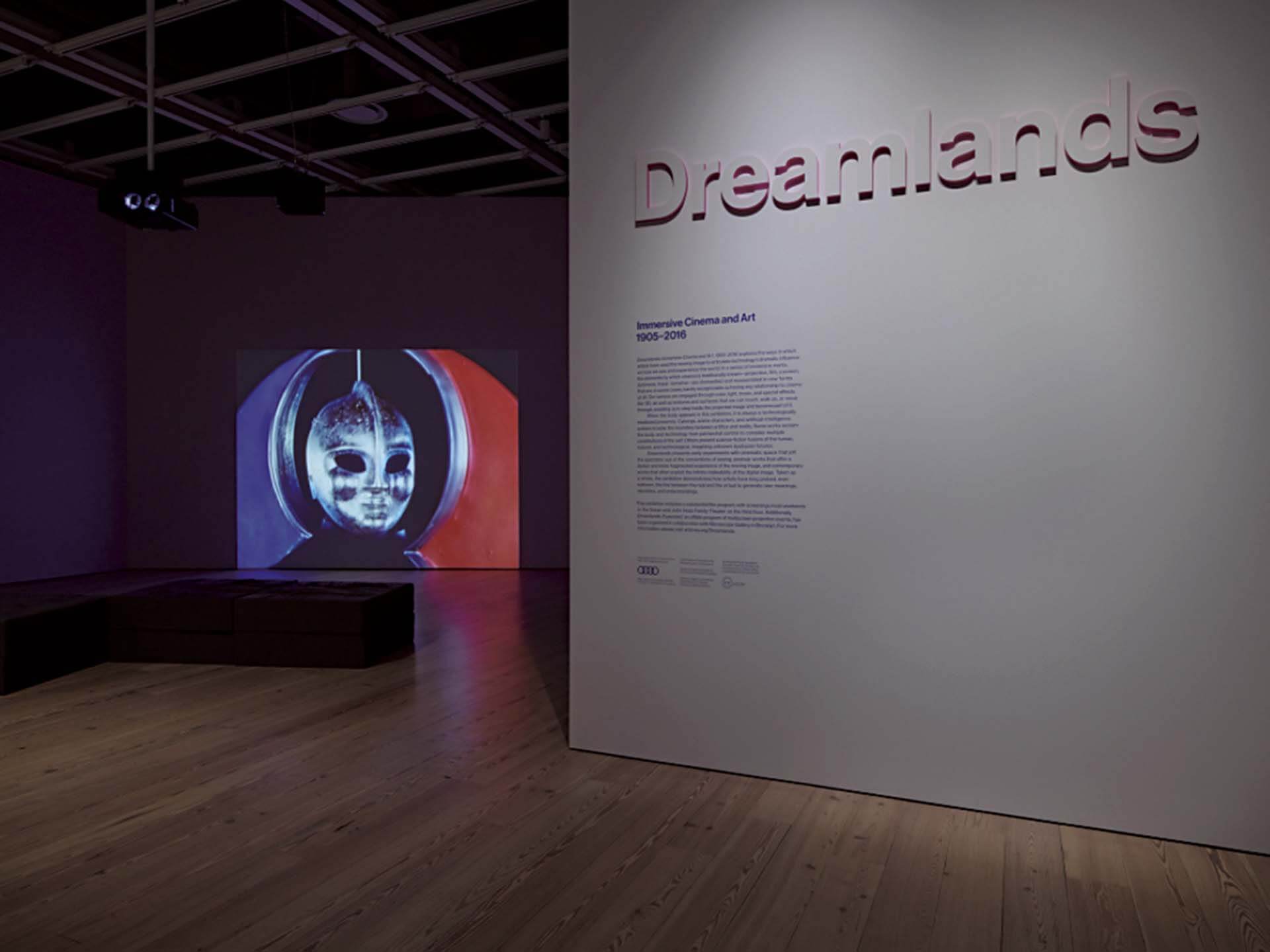 像是為了概念化新世紀科技發展對動態影像的挑戰,2016年惠特尼美術館舉辦了「夢境:1905至2016的沉浸式電影與藝術」的年度大展。有趣的是,策展人艾爾斯(Chrissie Iles)並未糾結於當前的新興科技,而是逆時地向後檢視這一百多年來藝術家拆解、重組電影的常規——螢幕、投影與黑暗——來創造關於動態影像的各式可能,並考察電影在這一百多年來的不同的沉浸空間實驗。也因此「夢境」一展,如同一場媒介考古的田野驗收,帶領觀者感受不同時空下的動態影像,如何打造出各種仿若不受物理限制的沉浸空間。展出的作品包括,以最極簡的方式邀請觀眾和影像互動、接觸的《線描述圓錐》(Line Describing a Cone,由Anthony McCall製作,或是希朵.史戴爾(Hito Steyerl)的錄像裝置《太陽工廠》(Factory of the Sun),以層層後設的動態捕捉工作室,讓觀眾在沉浸之餘(觀看動態捕捉的成果並為其包覆),同時理解其製作過程。