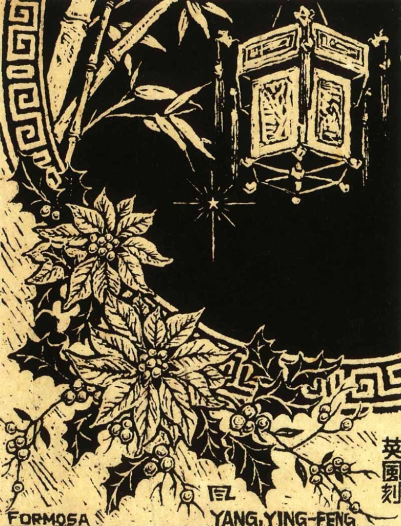 除了蔡草如使用臺灣的傳統廟會主題揉合耶誕節的代表人物聖誕老公公之外,楊英風1950年代在《豐年》雜誌任職時,也用木刻版畫的方式創作了《聖誕夜》的作品。但有趣的是,楊英風並沒有使用顯而易見的耶誕符號來表現,而是在右上角畫了一座傳統宮燈,有著卷雲紋裝飾的圓形漏窗分出畫面空間的內外,透出一點竹子,右下角則是聖誕紅與冬青葉的花束,組合成一個非常中國風味的圖案。除此之外,大概就是位於畫面正中央,但不容易發現的「伯利恆之星」點出此件作品的主題。