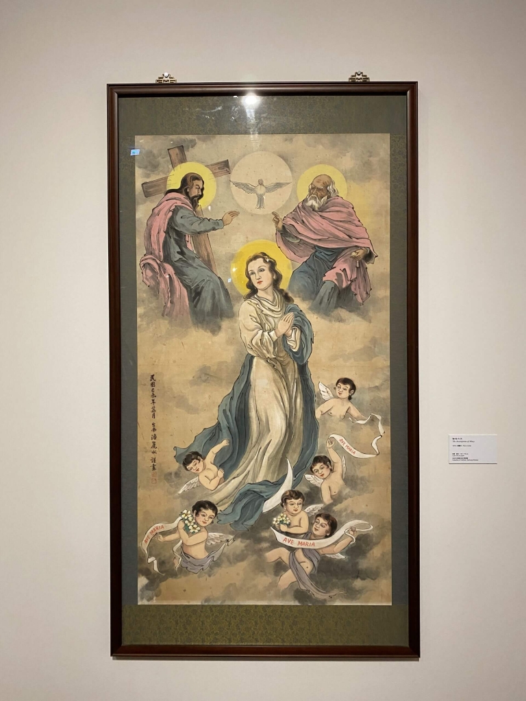 同樣是在臺南市美術館展出的「春源畫室:畫師─詩人─劇作家─承繼者」,呈現潘春源家族三代的畫藝與傳承。在諸多傳統水墨與宮廟壁畫等一般人較為熟知的主題外,展覽中亦出現由潘麗水所繪的《聖母升天》,此件作品雖然不是針對耶誕節的特定節慶,但以水墨設色的方式描繪傳統的基督教主題,相當吸引目光。中央站立的聖母雙手合十,腳下四周則有多位小孩模樣的天使,手裡拿著白色的花朵與絲帶,上頭寫著「AVE MARIA」。畫面上方兩側則是背負十字架的耶穌與上帝,中央的正面白鴿則象徵聖靈,即聖父、聖子與聖靈。這件由臺中天主教區主教公署所典藏的作品,顯然是委託之作,但也可以看到潘麗水以其嫻熟的技術,能夠因應不同的委託,呈現出各種主題及內容的能力。
