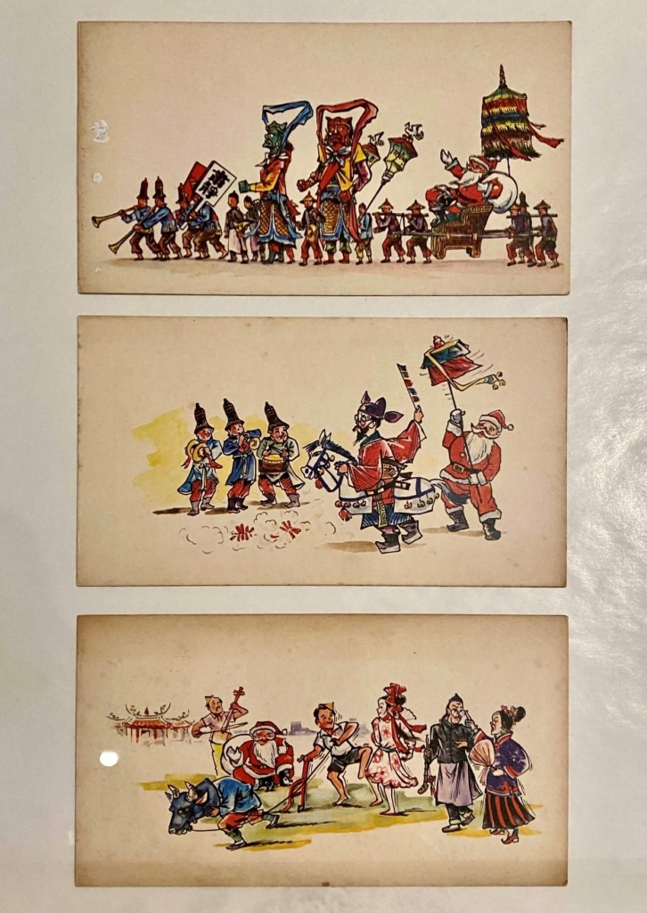 隨著近幾年臺灣美術史的熱潮再起,許多美術館紛紛舉辦臺灣前輩畫家的個展或主題展,許多過去未能公開的作品首度展示在眾人眼前,在這當中竟出現跟基督教或耶誕節有關的作品,頗吸引目光。比如2022年在臺南市美術館的「蔡草如:神話、戲臺與逆光赤城」,除了展出蔡草如較為人知的廟宇彩繪與膠彩畫作品外,在展覽中還看到他所繪製的耶誕節明信片,在一片以民間信仰為主的繪畫主題中,顯得極為特別。但更特別的是,蔡草如係將耶誕節的代表人物「耶誕老公公」放在傳統臺灣民俗的圖像中,比如廟會繞境的隊伍,耶誕老公公坐在像是神明的鑾駕上,又參加著各種不同的陣頭來助興,帶有濃厚的臺灣風味,趣味盎然。蔡草如選擇廟會的主題,大概是因為臺灣人在替神明祝壽時,也是使用「聖誕」字眼,便把耶誕老公公放入廟會主題當中,相互呼應。