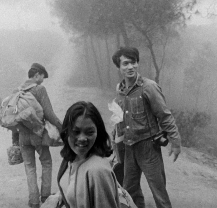 影片中的主角之一鄭燦昇曾言他的行為藝術(或是在當時被稱為「偶發」),是為了「突破無聊的生活」,而其中一種突破的方法,或許是重新丈量平庸的事件,像是成能慶的 《蘋果》( Apple,1976)與《這裡》(Here,1975)。兩件作品都以黑白攝影作為主要的紀錄媒材,同時顯示其創作宣言的不證自明。在《蘋果》中,我們看到十七幅十乘八吋的黑白照片,照片中成能慶閉目靜止不動地手拿著蘋果吃著。照片從左自右地開展,像是翻書動畫或是電影一般,不變的他配上逐漸縮小又再還原的蘋果。在每張照片中變動的僅有蘋果的大小:從飽滿到吃到僅剩果核,又再度復返成一顆圓圓的蘋果。
