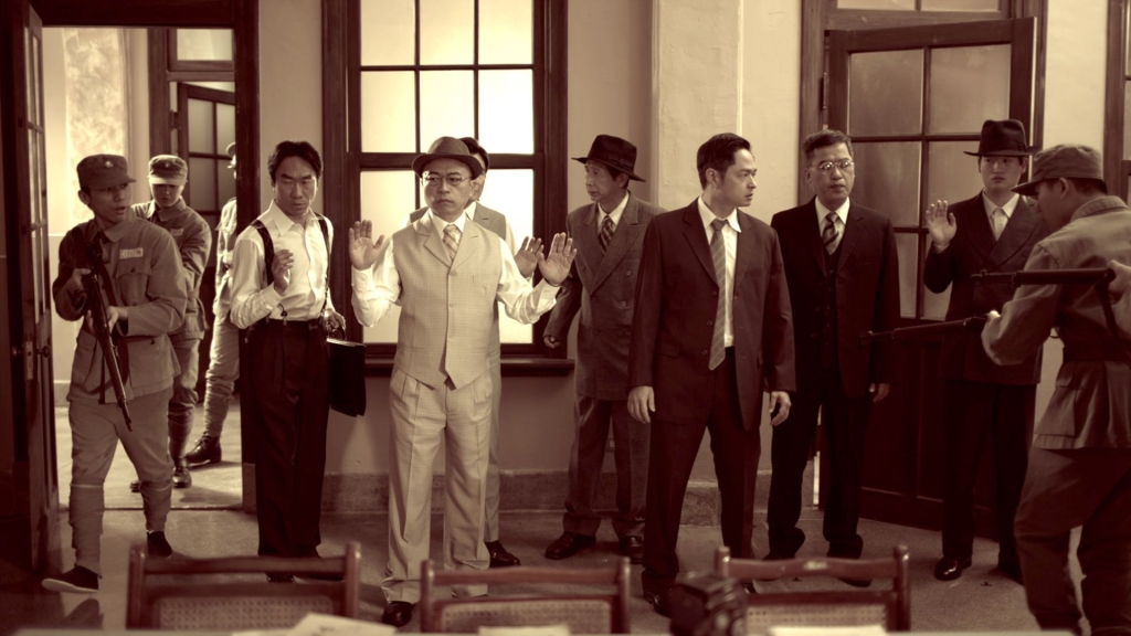 圖為《尋找湯德章》劇照,片中劇情重現3月11日湯德章以及黃百祿參議長、蔡丁賛等參議員在臺南市參議會被拘捕。希望影視行銷提供