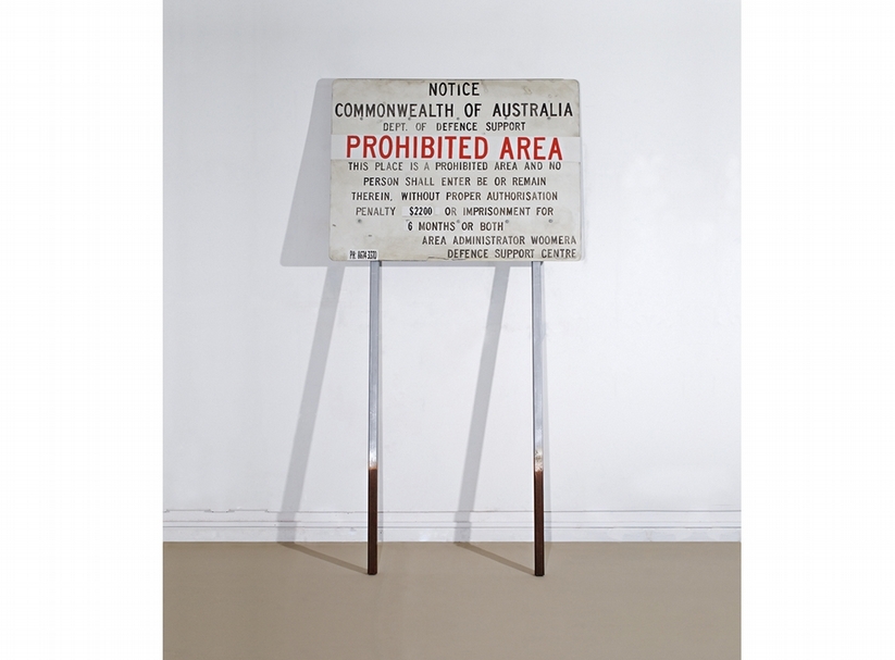 策展做為知識生產—這是當代藝術領域最為人熟悉的口號之一;對此,目前在澳洲巡迴的「黑霧焚燒的國家」(Black Mist Burnt Country)展覽,提供了一段有趣的參照。一踏入展場就看見的,是以斗大紅字寫著「PROHIBITED AREA」(禁區)的警告牌;紅字的上下方,還有更多黑色字句寫著:澳洲國防部已將此處列為禁區,任何人士不得進入,違者將被處以有期徒刑及罰款。那面警告牌,其實是諾頓(Adam Norton)作品《禁區》(Prohibited Area)。