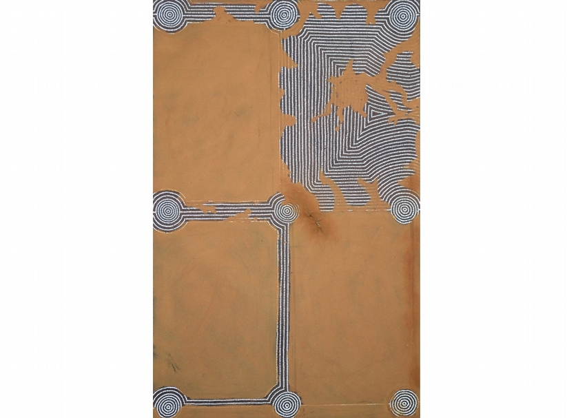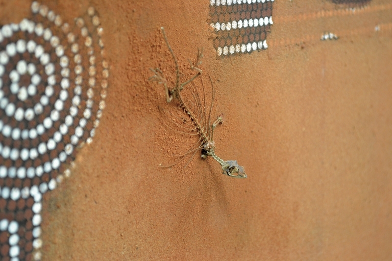 布朗Jonathan Kumintjarra Brown│Maralinga acrylic, sand and lizard skeleton on linen 167x106cm 1992 Ebes Collection © artist estate 圖│Burrinja Cultural Centre