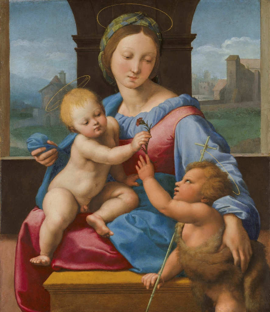 拉斐爾(Raphael,1483-1520)的《聖母子與施洗者約翰(加瓦聖母)》(The Virgin and Child with the Infant Saint John the Baptist [The Garvagh Madonna],約1510-1511)以聖母、孩童時的耶穌和小約翰為主角,三角的古典構圖,以柱子凸顯介乎神性與人性之間的聖母形象和神態,透露出宗教題材中於人性上的著墨。