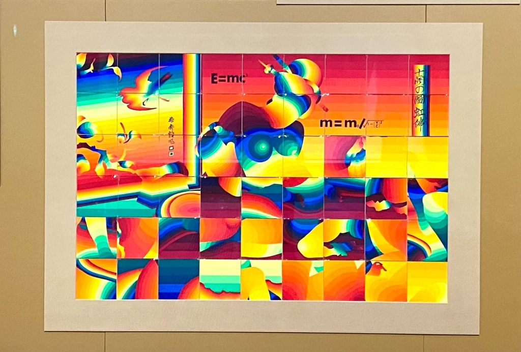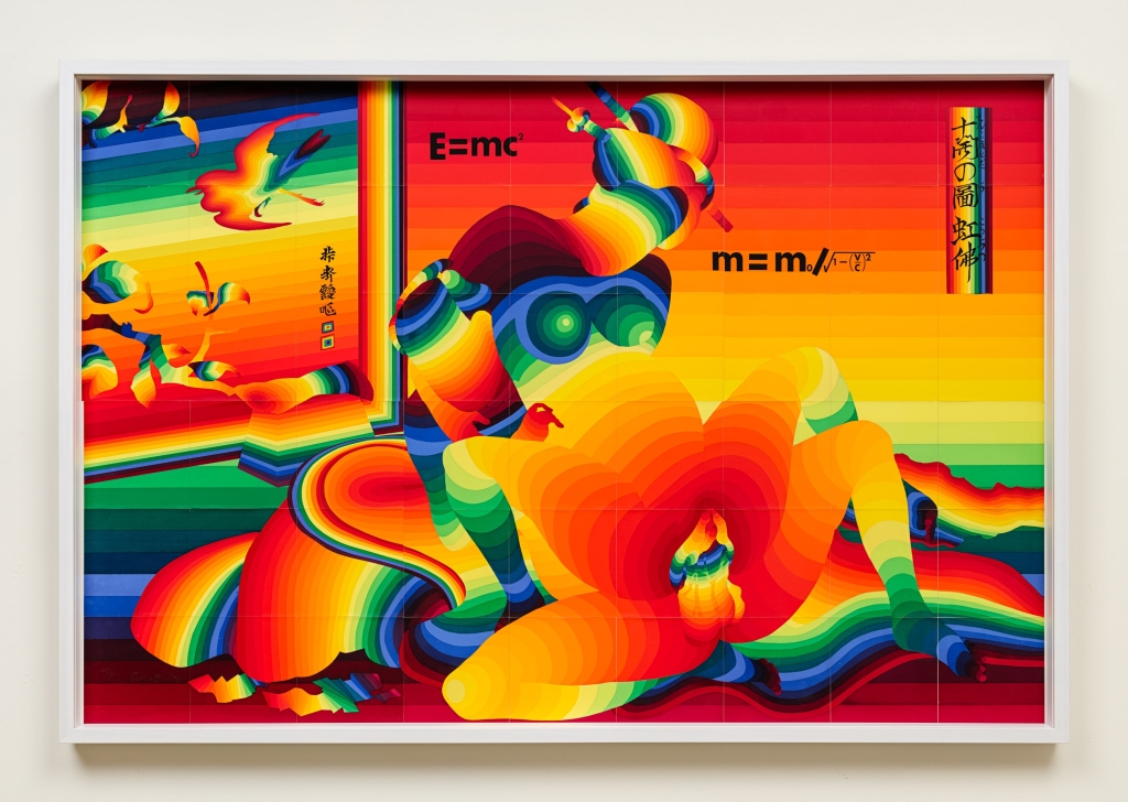 在以彩虹為方法接近真理的漫長過程中,靉嘔也遠非一成不變的古板先生,恰相反,他的作品中展露出豐富的幽默感、表演性乃至遊戲性。1970年創作的絲網版畫《彩虹北齋》尤為代表性地表現了這些面向,這幅由54個單獨印刷的方格組成浮世繪春畫,畫面中直接指涉葛飾北齋、愛因斯坦的狹義相對論公式來傳達對科學與藝術的尊崇與幽默轉化,除了此次臺北展出的版本,也可如拼圖般自行組合為抽象圖案錯落的全新作品,香港M+展覽中便可見其一。