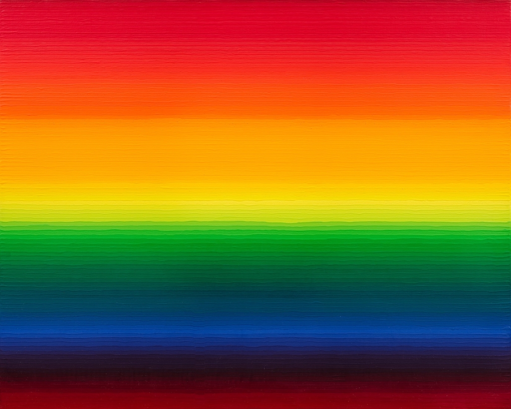 本名飯島孝雄(Takao Iijima)的日本當代藝術家靉嘔(Ay-O)時常被稱為「彩虹藝術家」,就其自1960年代便確立且持續發展的創作語彚而言,對他代表性風格更適切的描繪或許當是「光譜繪畫」,因為靉嘔並非單純以彩虹或彩虹形式為題材,而是以顏色光譜為造型觀念,在超過半個世紀的漫長創作生涯中廣泛探索跨越東、西的多重主題,闢出一條既富含獨特性、又具普世意義的特殊路徑。