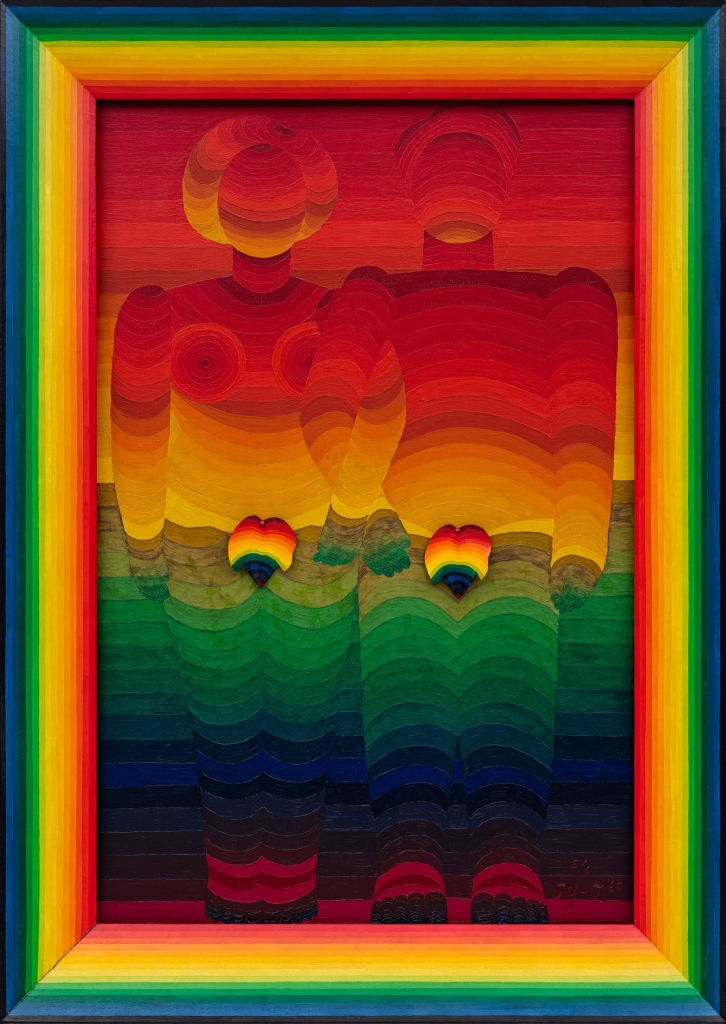 靉嘔創造性地不在不同顏色之間作出選擇,也不在特定顏色與特定物體之間建立直接聯繫,而是思考視覺與顏色的本質。1962年後,靉嘔就不再以傳統的表達方式來創作繪畫,他獨樹一幟地用可見光譜內一切顏色序列作為基礎造型元素,這些顏色序列平等地出現在所有物或人身上,整件作品自然如佈滿彩虹,繽紛而有序。此次展覽中幾件早期作品,如油畫《亞當與夏娃》(1967)、裝置《虹的階梯》(1969),也可窺見靉嘔以裝置形式創作彩虹光譜作品的早期形態,它們後來才逐漸發展出純粹的平面畫作。