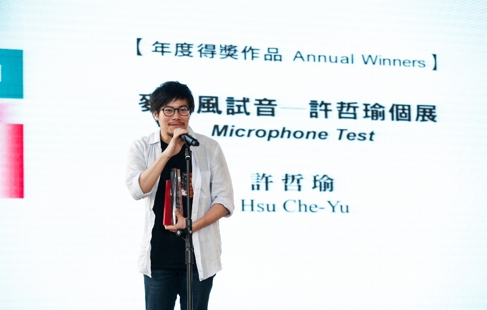 「麥克風試音─—許哲瑜個展」從合作模式、經驗、影像到記憶都充滿疊影的狀態,許哲瑜也剖析疊層形式於其作品中的意義,作品的第一個層面是許哲瑜身邊三位朋友的家庭故事,第二層是文字合作者陳琬尹的視角與她的記憶,最後再疊合文學家作品、身世與新聞事件。與其類比這些敘事的疊合為圖層,許哲瑜認為它們之間比較像是平行事件,但巧妙的是「這些故事雖然悲傷,卻帶有一種普遍性」。這些平行的敘事最終居然產生共鳴,差異、真實、虛構的死亡事件在個人性之下映照出廣泛的集體性,如同鏡像疊合出異常真實的實體。關於這件作品的影響與價值,陳琬尹補充雖然這次入圍者許哲瑜是最為資淺的,笑稱他如同一個屁孩出現在這場典禮,但這個展覽卻蠻能觸動與他們同年齡層的觀者,產生共感與共鳴,每個人的生命無論長短勢必都累積一定的故事,「我們不用刻意去挖掘深厚的議題,而是從身邊的人經驗、記憶探訪起,這未必只會產生薄淺的結果,這次的肯定或許也是訴說著:寫下屬於自己的故事,也不會是一件壞事。」頒獎典禮結束向許哲瑜道賀的台北市立美術館館長林平,除了回饋對於作品的感動,也提醒著初獲肯定的年輕創作者,「商業性的產出一定會跟著來,但務必要好好把握自己的步伐。」也許此刻的往後,對於許哲瑜來說更是藝術家生涯挑戰的開始。