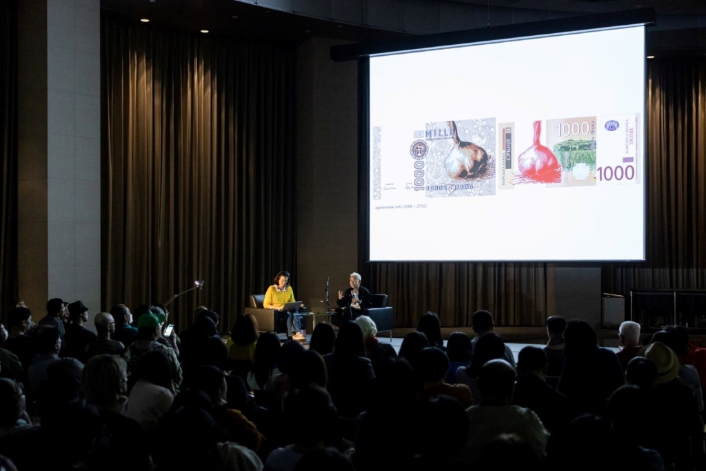 最後到了第三個子題「技客田農」,「技客」(geek)一詞所指的是「看似怪異,行動不符合社會期待,具備特殊領域知識且有前瞻技能者」,鄭淑麗將此一意象引入自身。與田農的連結最早可以追溯到2002年前後,鄭淑麗嘗試與農夫合作「大蒜計畫」,並且當時正值美國國會討論「網路規範國會法」(Internet Decency Act)之際(註6),她將大蒜散溢的味道比做空中的無線網路,認為這應是屬於公有的財產、頻道,而非單屬於某些財團的私有物。這件作品也開啟了她後來的《大蒜元》與《大蒜元2030》網路計畫,設計了一種全世界通用的虛擬貨幣──有機大蒜。鄭淑麗想像了這種去中心化的統一虛擬貨幣,瓦解了國家的疆界與貨幣的概念,創造了一種網路烏托邦。《大蒜元》計畫亦曾代表臺灣參加由林書民策劃的2003年威尼斯雙年展臺灣館「心感地帶」的展出。(註7)