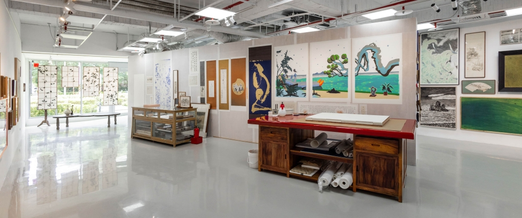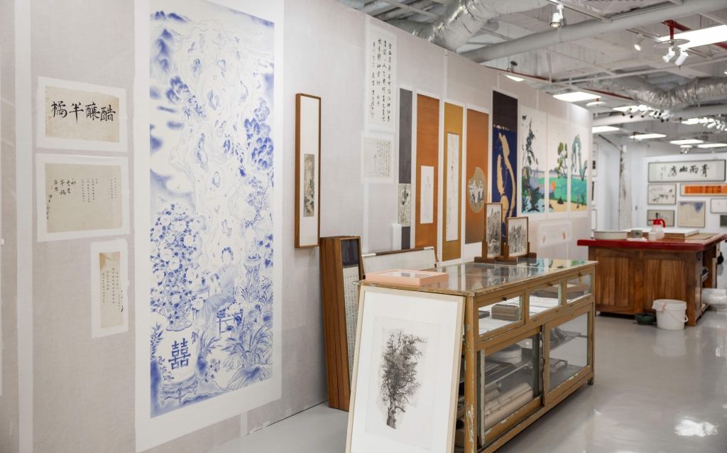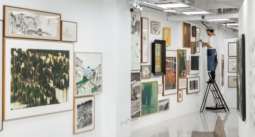 吳挺瑋將裱褙店的工作日常搬了大半至展場。大工作桌和玻璃櫃各一,備用紙材、工具、待裝裱修復的作品,甚至隨處可見的綠植花草,都是吳挺瑋和工作伙伴們日常工作的樣貌,甚至展期內吳挺瑋還是會在現場繼續裱褙的工作。而作為展覽的重心,空間內錯落著或掛、或懸、或立的書畫、水彩、油畫、版畫,創作年份跨度超過一個世紀,其中有從藏家手中再借展回來、重新裝裱的作品,也有不少全新委託之作,70位藝術家、逾200件作品的驚人體量,竟安處一室而無衝突之感,崮中奧妙,便是吳挺瑋所欲表達的「裱褙店日常」。