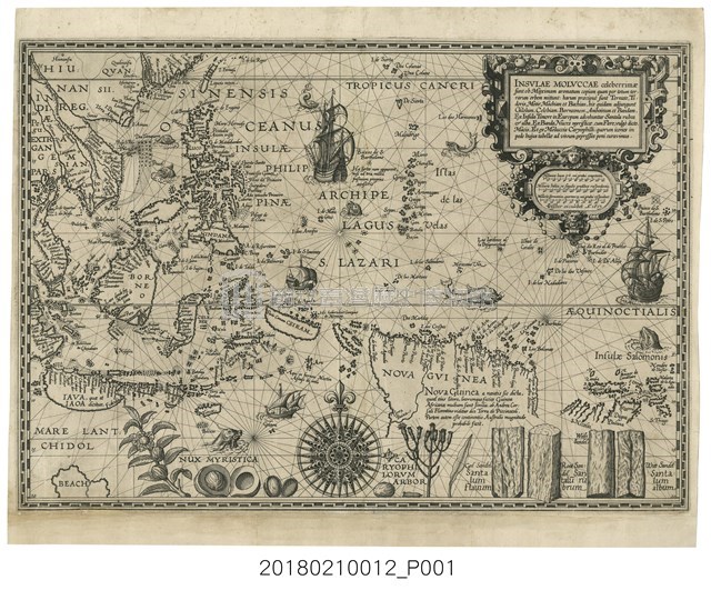 註3 《摩鹿加香料群島圖》(Insulae Moluccae celeberrimæ sunt ob Maximam aromatum copiam quam per totum terrarum orbem mittunt)是由16世紀的荷蘭地圖學家彼得勒斯.普朗修斯(Petrus Plancius)根據里斯本的機密葡萄牙圖稿編譯而成,圖面中繪製的摩鹿加群島位於現今蘇拉威西島(Sulawesi, Celebes)東面、新幾內亞西面以及帝汶島北面,以其盛產的香料著稱。若以荷蘭地圖的製作角度來看,這張地圖展示當時荷蘭人對東南亞地理認識的巨大進步,包括巽他海峽、摩鹿加群島以及大部分大陸海岸和菲律賓群島(如呂宋島和民答那峨)都擁有精細地繪製。雖然其中的一些島嶼群依然簡略不清,但它們的相對位置已經較為準確。詳細內容可參考:林孟欣編目,PLANCIUS, Petrus〈摩鹿加香料群島圖〉,國立臺灣歷史博物館,2019/09/16。