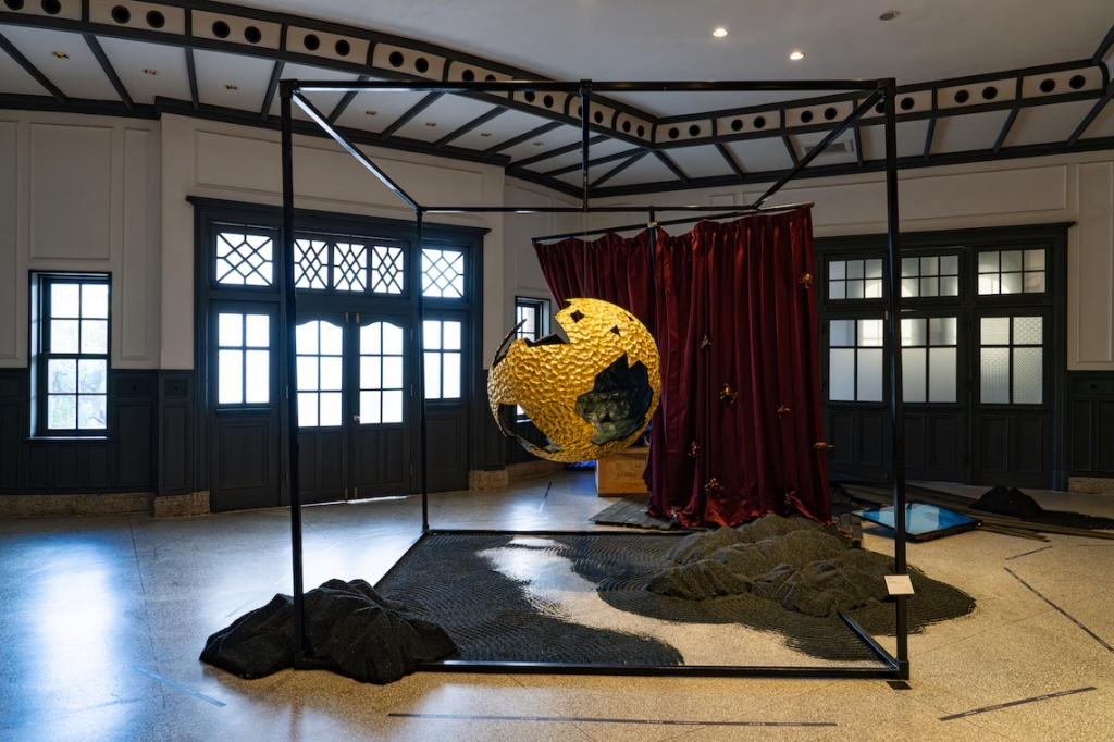 甫入南美館一館的展廳,映入眼簾的即是邱杰森與莫珊嵐的作品《黃金時代》,一顆碩大的金色球體,點破展覽子題的帝國殖民時代背景。這件作品以16世紀林斯豪頓(Linschoten)的《東印度水路誌》中的水手見聞、鄉土神怪傳說以及地圖等為概念發想。