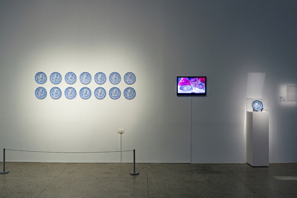 穿過刺繡掛件,上面以荷蘭文與西拉雅文刺上馬太福音:「將世上的萬國、與萬國的榮華指給祂看。」翻過掛件,似是翩飛起大航海時代對於世界的探索的時空背景。穿越到另一個展間,是許家維的《武士與鹿》以鹿皮交易串起了17世紀的武士文化、柬荷大戰與臺灣的複雜關係。以及鄭亭亭的《山寨藍色柳樹》,指向西方人想像中的東方風情商品。勾勒出帝國時期前往臺南的動機。