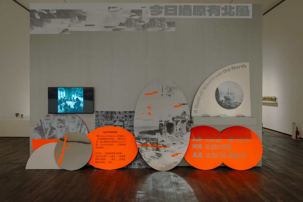 隨著荷蘭人與臺南此一地開始接觸後,開啟了展覽的第二個子題──「遭遇與共生」。展場中展示沈建龍以東寧(註5)時代生活樣貌創作長達27公尺的長卷《東寧臺灣圖卷》,他耗費多年心血考證與對比各方文獻資料,並請教臺灣史專家的意見,歷時四年多創作,重現近400年前的臺南。與之對比的是邱璽民與汪怡君的《今日猶原有北風》,作品取自《熱蘭遮城日誌》中紀錄的文字,將當時職守士兵的紀錄轉換至電話線圈簿中,以當今的視角再次閱讀文獻中並不嚴肅,甚至有點好笑的生活片段。李立中的《Pontanus的日誌本06:蕭壠城記》則是追溯VOC的船員Pontanus視角下的飛鴿,以鴿之翼展示蕭壠地區的古今變化。