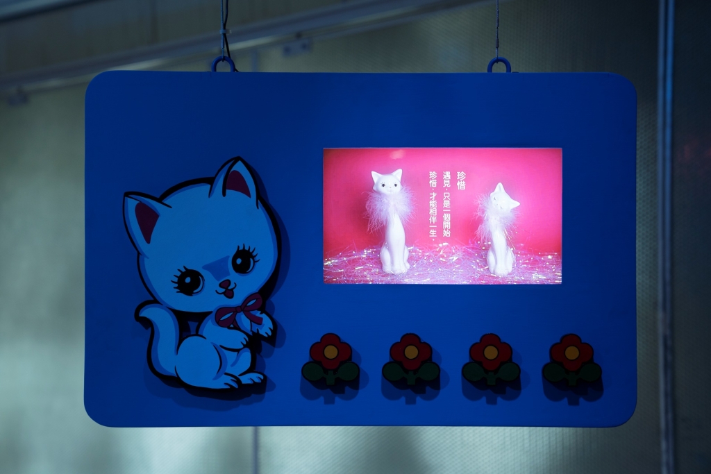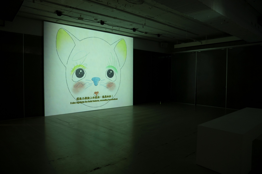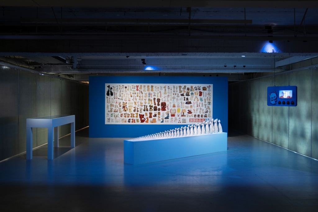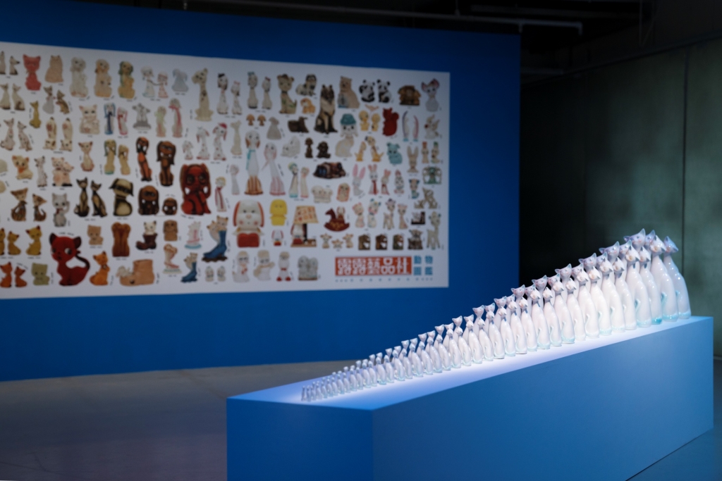 展場中間,有一張印滿謝佳瑜所收藏的陶瓷寵物的海報,她以類型、材質、物種等元素進行分類。從中可以發現,不同上釉色彩的瓷器會共用同一組模版,或者是翻模再翻模出的瓷器。並且這些圖樣之間,也都可以察覺彼此的相似連結,一樣的招手姿態、尾巴位置等,似乎成為一種「混血」,並且在不同工匠的改良、挪用元素後「培育」新的瓷偶種類,彼此相織相交成一片系譜。