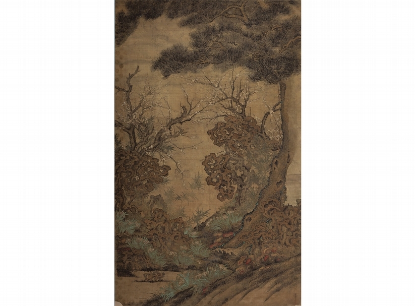 (2)該畫缺失最嚴重的是畫幅右側松樹主幹至外邊部分,超過一半的樹幹缺失,樹幹右側應該還有延伸過去的山石和竹枝,以及向上延伸的梅花枝條。但因沒有任何原始資訊可以做為原畫畫意結構之參考,遂根據文物修復「最小干預原則」,不再進行缺失畫意的補筆,只全底色。