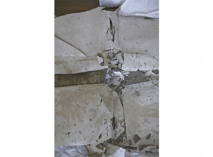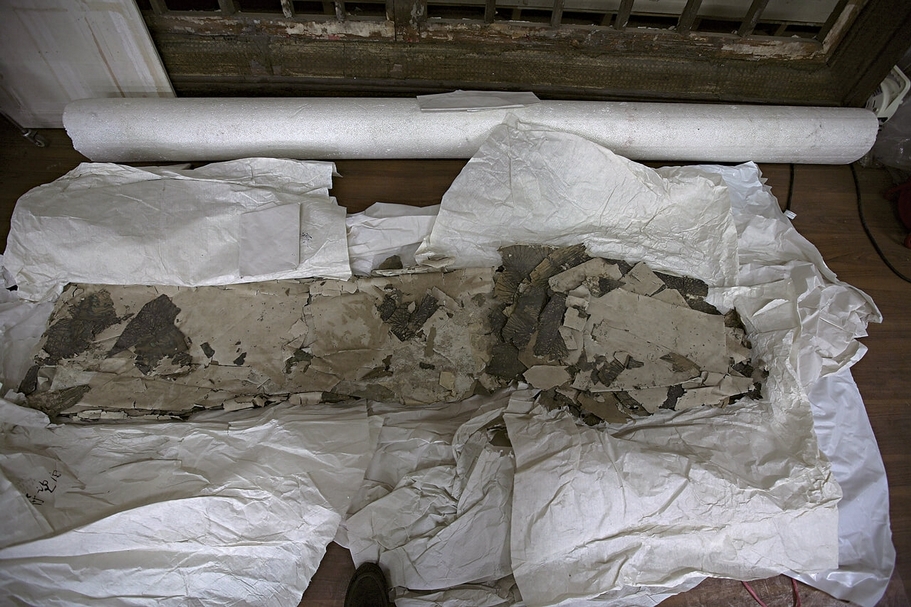 原包裹送來時,基本保持原來的形狀;儘管最初在整理收捲時,造成畫幅的二次損傷,產生大量碎片,但多年來包裹從未遭人翻開,所有脫落的碎片大都維持在破碎時的原始位置附近。正因如此,打開包裹時,一定要儘量保持原來的狀態,把折斷處附近的碎片集中收集起來,並記錄所收集的碎片與原畫幅位置,以方便日後拼對。