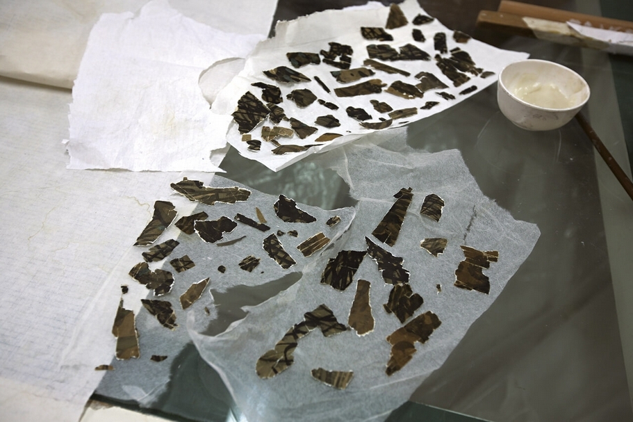(1)背面的襯料層:用漿水將兩層棉紙刷平在案台上為襯料層,也作為畫心從案台上揭起時的保護層。最後再刷上一層稀漿水,將較大斷裂體正面向上平放在棉紙襯料層上,用水潮透,讓其自然伸展漲開,使皺起扭曲的所有茬口和變形部位得以恢復原有平整狀態,而後利用水的浮力將斷裂處茬口糾正對齊,再用毛巾吸乾水分使其定形、定位。當所有缺損輪廓都已清楚顯現在趨於平整的畫面上,便可再根據缺損輪廓和畫意的結構走向,將尚未重定的小碎片歸位銜接。