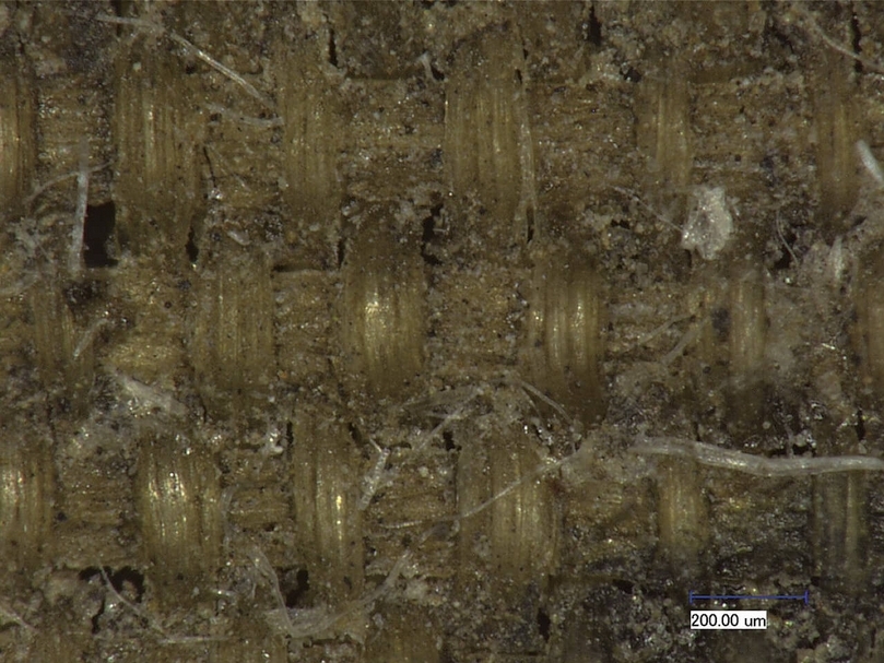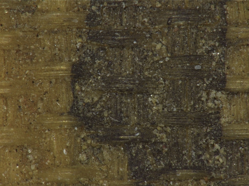 在修復前,先使用Keyence牌VHX-600超景深3D視頻顯微鏡,對畫絹本體進行觀察分析,一方面保留文物修復前的真實資訊,為制訂修復方案提供依據;另一方面亦為修復補配材料提供參考資料,如補絹的選擇。從無托紙的絹質畫心殘片放大200倍的顯微結構照片(圖3),可知該畫絹本質地較緻密,絹絲光亮飽滿、排列整齊,但也可見絹絲之間的微小空隙。而由帶有托紙畫心殘片顏料部分放大200倍的顯微照片(圖4),可發現繪畫處顏料遍布,並未在空隙處透露出背後托紙,表明塗過顏料的部位也滲透到下面托紙層。清代貼落為便於著色,常在托好紙後的絹上作畫寫字。以此方法繪製的作品,畫面層的墨色、顏料會滲印在下面的托紙層上。對於此類作品,在修復過程中尤要慎重揭去後面的托紙,因為一旦揭去後面的托紙,畫面的墨色、顏料也會隨之部分脫落,顯露出絹絲之間的空隙,使得畫面失去靈動而顯得生澀。經使用測厚儀測試畫絹的厚度(加托紙)為0.23公厘。