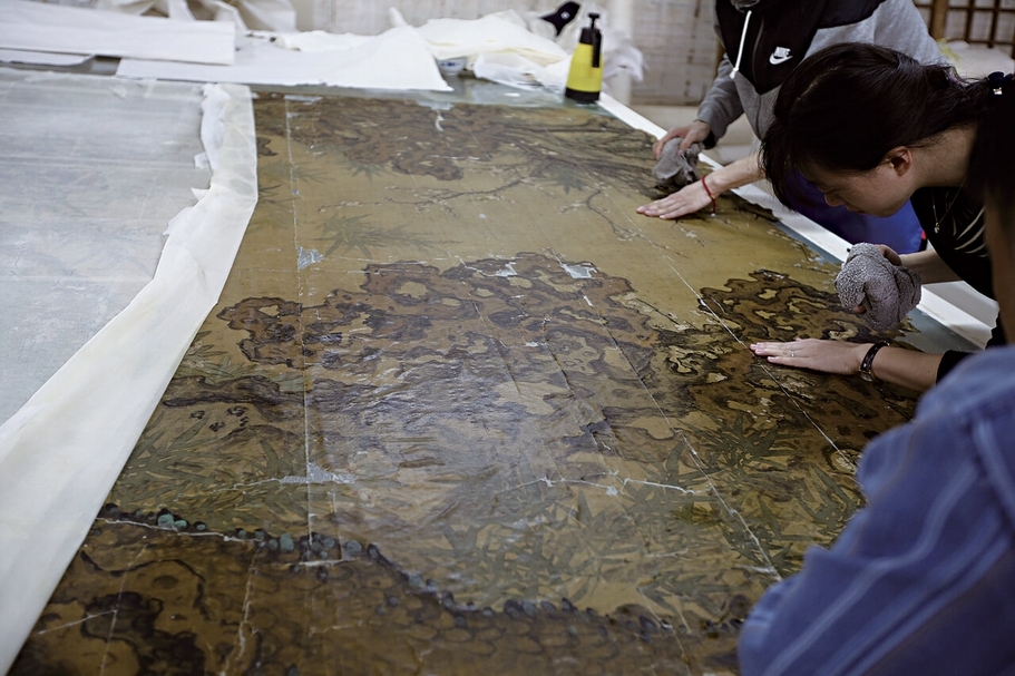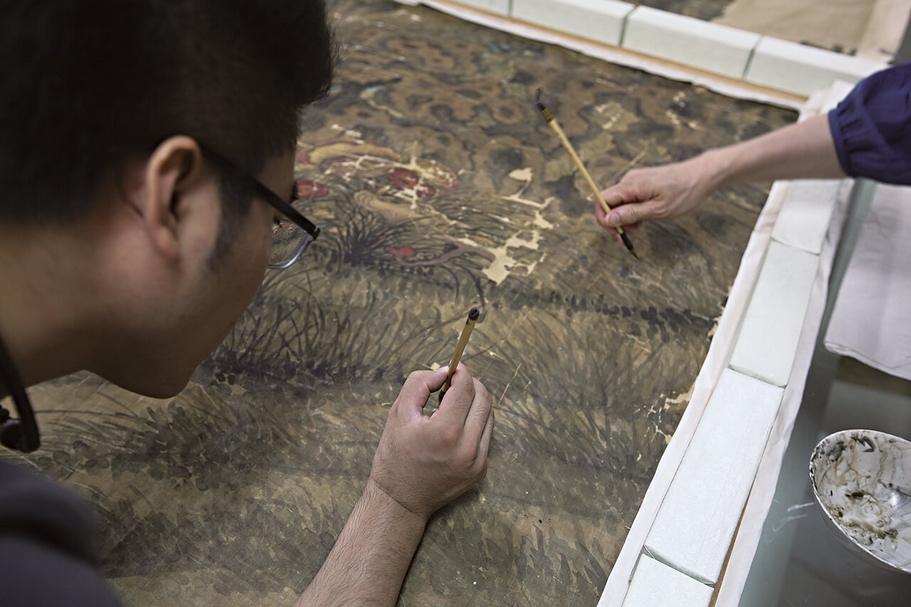 之前在單獨加固處理每一段時,事後都需揭掉畫幅正面作為加固層的宣紙層,以使每段上的畫意顯露出來,便於核對拼對每段上的小碎片和畫意,進而找到碎片的準確位置。然而,在連接兩段時,則需於正面重新刷托上加固層的宣紙,而不再揭去,使每段連接成一個完整的加固層,目的是為了在完成連接處理後,藉助泡沫筒將過長的畫幅捲起,以做後續連接。整體連接完成後,還需將畫幅整體再翻扣過來,加以揭背、補綴和托紙,再將其重新轉正,並全補顏色等。這是因為該畫破損、缺失嚴重,絹補綴的地方太多,如果沒加上加固層襯托,補綴過的畫幅會太單薄,捲起時容易在補綴處折斷。這層加固層宣紙直到全補顏色前才會被揭去。
