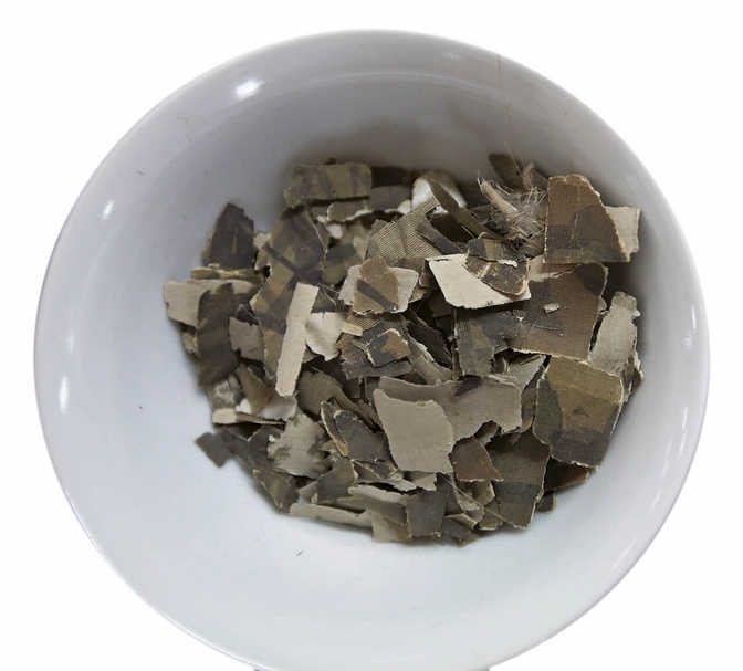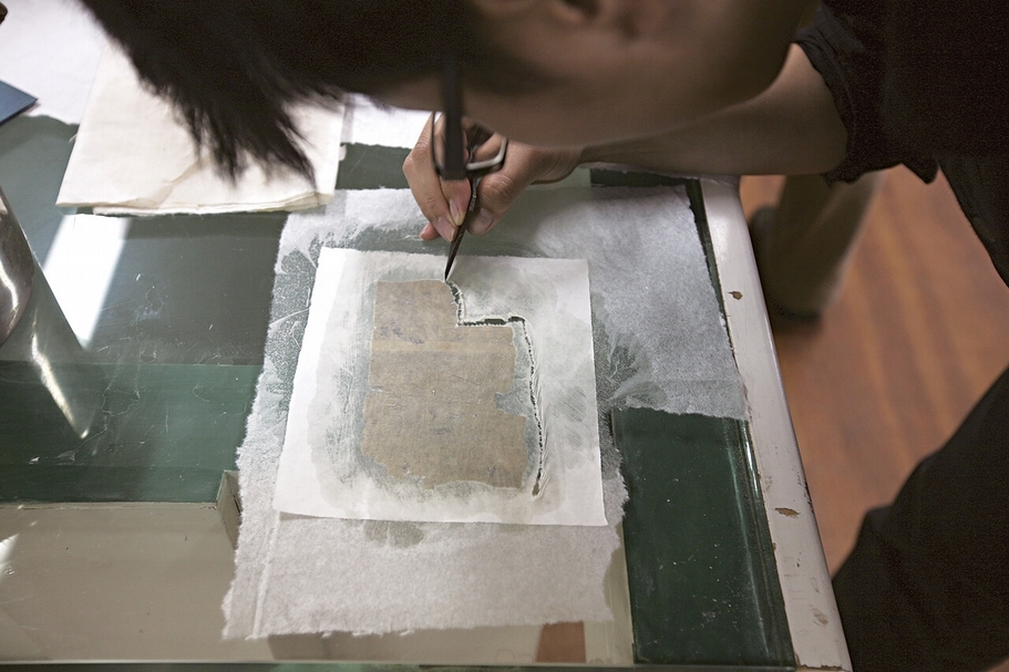 碎片是指畫幅包裹中散落且相對獨立的細小碎片(圖5)。該畫絹本質地已經糟朽,若欲將碎片在畫幅上拼對連接起來,尤其是面積小的碎片,需以手持或用鑷子拿起。此外,糟朽的碎片亦有再次碎斷的危險。因此在拼對前,需提前將這些碎片加固處理。加固時,先將碎片用清水清洗展平(畫幅正面朝上),待裂縫處拼對整齊後,將一層棉紙刷平於畫幅表面,再將畫幅與棉紙一同翻扣過來,此時,畫幅背面朝上且置於棉紙之上,然後在碎片背面用稀漿糊水將一層宣紙刷在上面,宣紙要大於碎片。若有碎片背後還殘留原托紙,可於此時揭去再托上宣紙。最後,將棉紙、畫幅碎片、宣紙三層一起再次翻扣過來,揭去正面加固用的棉紙,並用馬蹄刀沿著碎片邊口的形狀刮掉多餘的宣紙,形成和原邊口一致的形狀。(圖6)用此方法加固處理後的碎片,畫意會顯露出來,清晰可辨,清洗展平時也會去除掉髒汙。背面的宣紙則有臨時的加固作用,便於碎片之間的互相篩選比較、核對拼接,找到碎片在畫幅上的準確位置。(圖7)