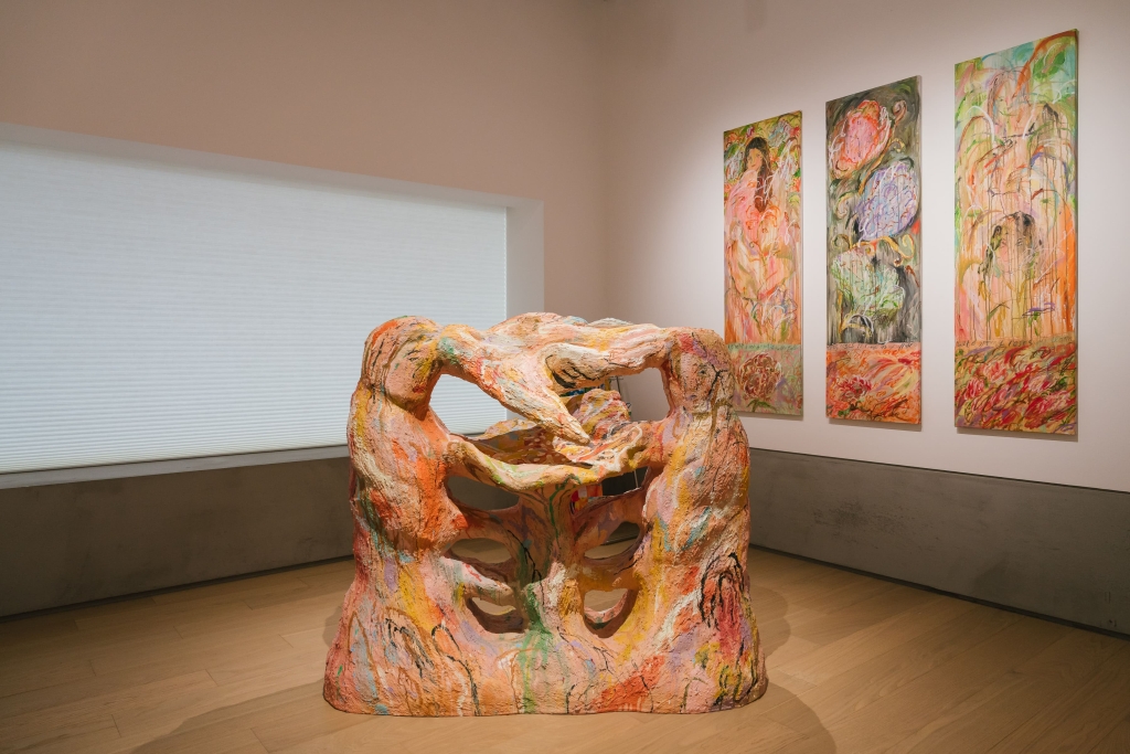 與展覽中的這些作品異曲同工的,是一本兩年前完成的藝術家書《Everywhere Girl》,設計自Juli Baker and Summer為《Nowhere Girl》雜誌撰寫的專欄內容。宛若將自己完全展露時在表現手法上的一體多面,既呈現為親密的表達,也具有大膽甚至挑釁的姿態。同時展出的彩繪雕塑《鴿子郵差》(The Pigeon Post)則直接以鴿子作為自由的象徵,透過形體輪廓的相連,與繪畫作品中密織、交疊顏料與線條而形成的曖昧形成呼應。