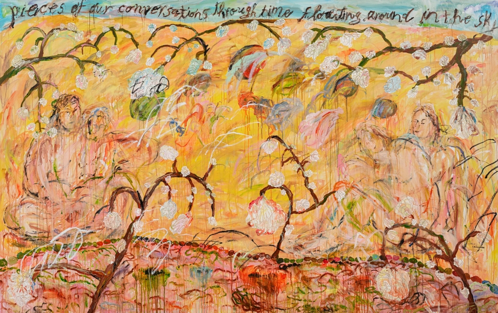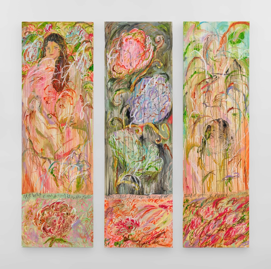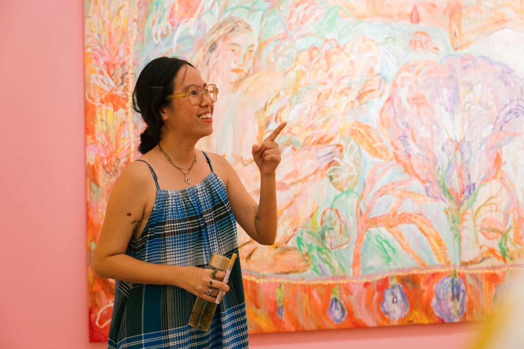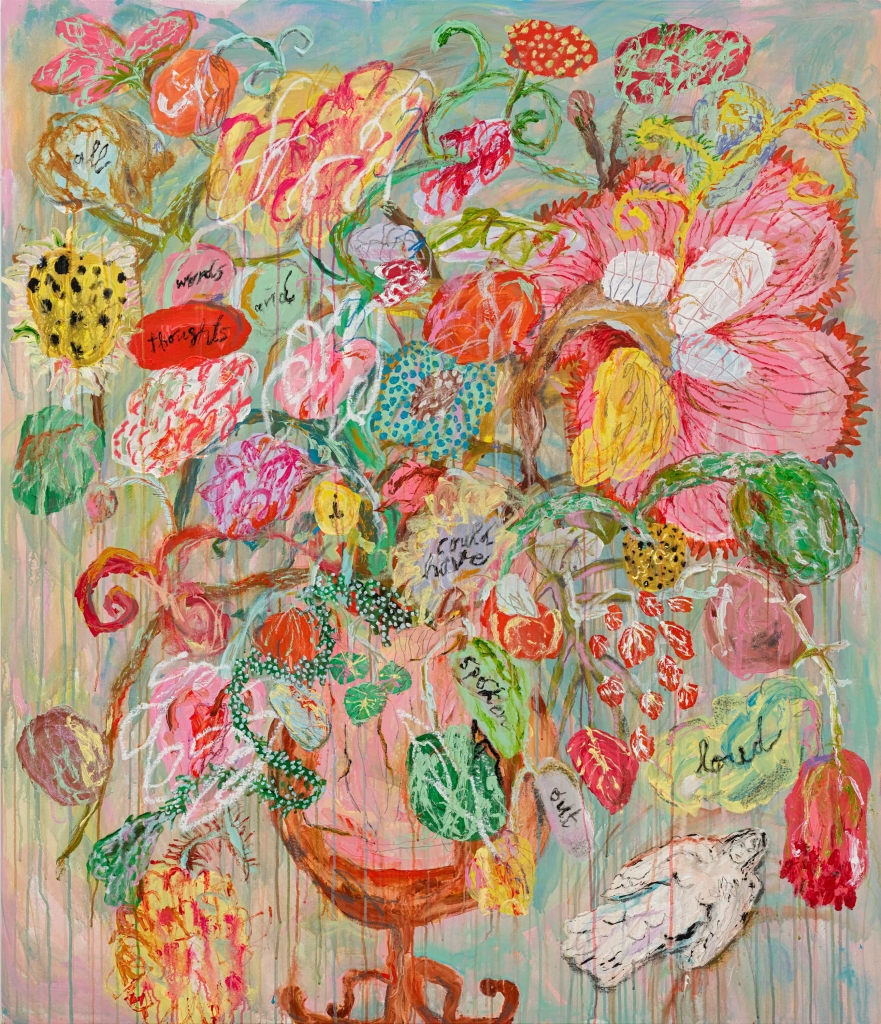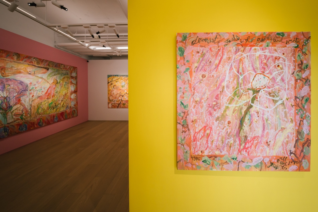 強烈的視覺衝擊之下,不難發覺許多畫作中都穿插著藝術家略顯潦草、已具個性標誌的英文字跡,這些隻言片語與周遭繪畫性的元素共同勾勒出幾封信的輪廓。這些「信件」所書寫的對象,包括自1980年代起開始就藝文界性別和種族平等這樣諸多問題發起抗爭的「游擊隊女孩」(Guerrilla Girls),包括直至當代仍為言論自由而抗爭、甚至絕食而亡的泰國人權活動者和政治犯,也包括她去年與世長辭的祖母,乃至她自己。甚至也有宣言式的作品《Women Who Write, the Manifesto》,獻給所有「可以既勇敢、又脆弱」的女性書寫者/創作者。