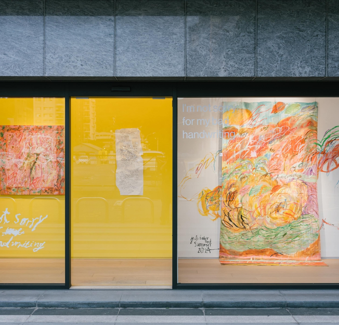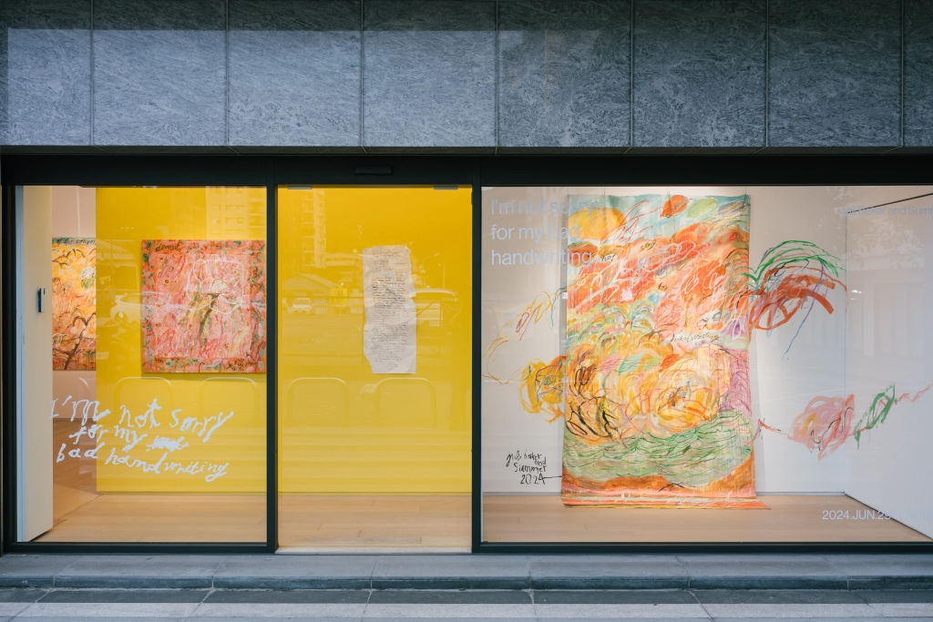 棲身臺北士林街巷中的Artemin Gallery,近期在實體空間創立一週年之際,邀請知名設計團隊Bito打造全新品牌形象,也從過往主要關注臺灣及歐美視覺藝術的路徑再向前推進一步,推出泰國藝術家Juli Baker and Summer的首次臺灣個展「I’m Not Sorry For My Bad Handwriting」。入口櫥窗的繪畫作品以及牆面、玻璃上的塗畫與字跡給人留下活潑與明快的印象,而一旁貼著一紙揉皺的手書信件,潦草字跡與刪改痕跡,帶來一絲不一樣的氛圍,彷彿某種誠懇而深沉的主題呼之欲出。