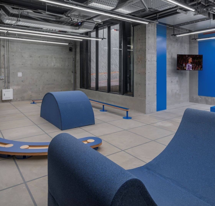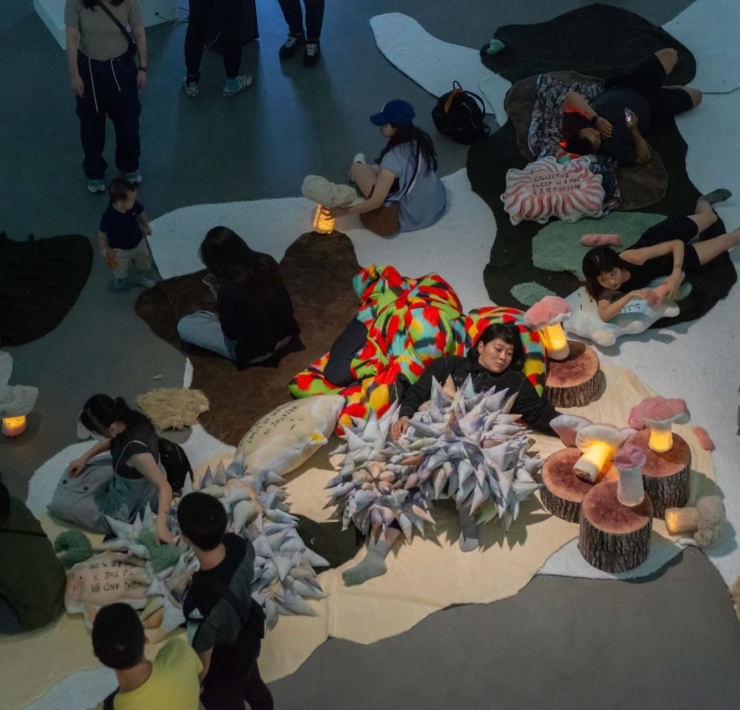 而展間中的岩塊、滑板、板球、以及一雙來自印度前頭掛有電動清潔刷的紅色溜冰鞋,都在接下來的展場中巧妙地再次現身,除了用軟性的造型雕塑打造非常規的滑板場地外,同時也可以看到展示物件與展場內其他作品的連動關係。整體來說,策展人鄒婷意圖從建築、運動員、運動器材等在體育賽事中不可缺少的項目,來呈現運動的「花式」意義,也為我們預告接下來的體育課,運動將不再只是運動,更有對於文化、人權、殖民、既定想像的討論。