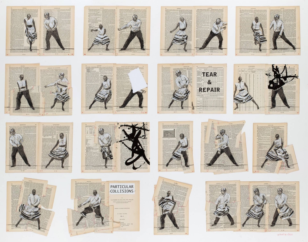 今年初肯特里奇與朱迪斯·巴特勒(Judith Butler)的一次對談中,後者問及「手執炭筆創作時、是否是有意識地行事?」肯特里奇回答:「既非隨機、也非預先計劃,而是介乎二者之間。」(註4)這一難以明確的「中間」狀態同樣具備充滿想像力的開放性,某種程度上,也與他在整個藝術創作中定義自身位置的方式異曲同工。在一些發展為動態影像的素描中,肯特里奇自己也以白衣黑褲的經典形象出現,如這次也有展出的《特定碰撞》(Particular Collisions,2013),他與另一身著舞蹈洋裝的女舞者的素描形象並陳於舊書頁上,二者互動、對話、碰撞甚至交換各自形象中的一部分。在工作室中,作為藝術家的肯特里奇與那些材料、形象和媒材之間,彷彿建立的是一種不斷彼此商榷、彼此交換的平等關係,而各種各樣的創作,就從這些關係的互動中、以就連藝術家都難以預期的方式流淌成型。