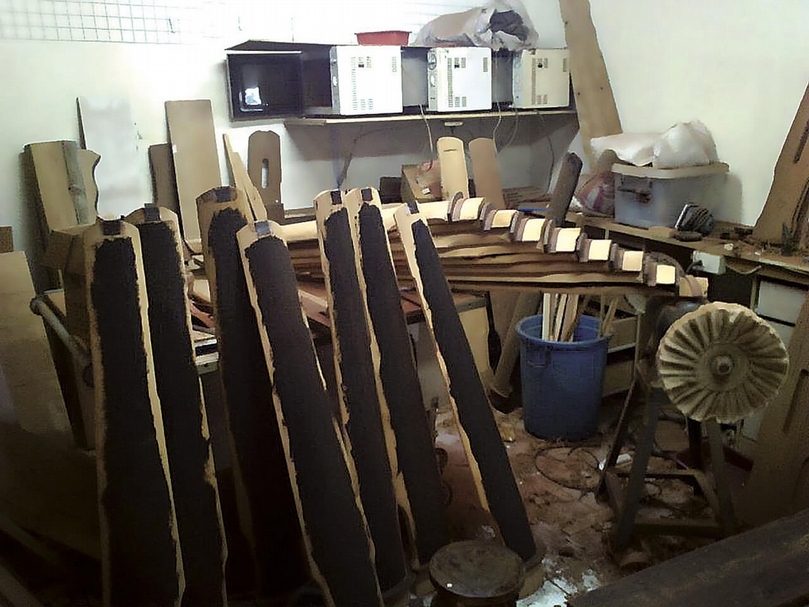 選擇好木料之後,還需要將之置放一段時間令其乾燥,鄭德宣說明箇中因由:「當樹脂完全分解掉、消失之後,木頭和木頭之間的纖維形成空洞,這樣對聲音的延遲有好處。理論上是可以用人工把樹脂拿掉的,古代人有這樣做過,他們把古琴丟到造紙的槽裡面去,放個一年之後,又把琴拿到會流動的溪水裡去浸泡一年,拿起來後放到封閉的甕中去蒸乾。所有的物種都是微酸性的,造紙的槽充滿石灰,是鹼性的,所以將古琴丟到含鹼性的池裡面,酸鹼中和之後皂化,但是皂會滲透到每個毛細孔裡面,所以要放到流動的溪水中洗掉。在現在這個時代有很多工業的方法可以處理它,但是那些方法一定會影響琴的壽命,只不過那至少是300年以後的事了。以天然存放木頭的方法,損失木料都將近一半,木頭會裂掉、曲翹、變形,不過也就等到材料用到都沒有了,再去整理它吧。其實木頭先變形、先裂開沒有不好,因為它本身的性質是不穩定的狀態,等你做好才變形那才麻煩,所以木材一定要放,這種時間沒有辦法減省。這也是為何老木優於新木,因為老木頭的膠和油脂都已經降到很低,所以共鳴效果會比較好。」