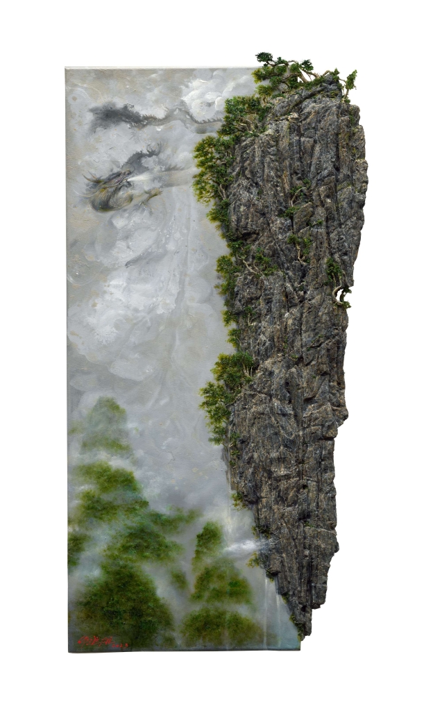邱進雄透過外在實際的風景體驗,結合內心的心靈景象,創造出畫面中的山水雲霧。而繚繞的煙靄中,還潛藏著「龍噓氣成雲」的神話傳說。他以《易經》中「雲從龍」的典故,描繪龍是為雲之創造者形象,點出雲化雨、潤大地的生命循環。他參考了水墨的山水構圖,以銀色為基底,勾勒虛實交錯的山水景象。