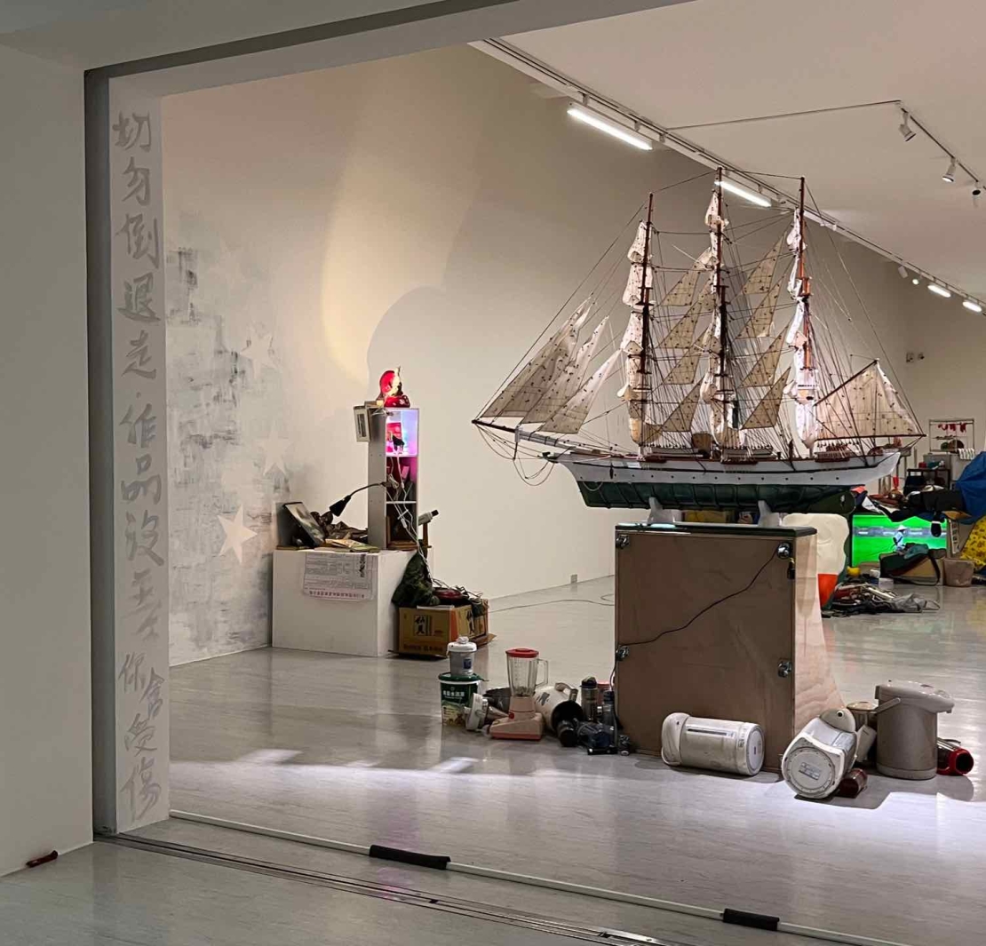 入口處擺了一艘大帆船的模型,船帆上黏滿無法脫身的蒼蠅。一旦蒼蠅從「fly on the wall」(隱身的觀眾)變成「itself in a bind」(陷入困境的自己)時,不僅「一帆風順」的意象瞬即瓦解,連同船下的一波巨浪、散落一地的水杯、水壺、水瓶、水泥漆、熱水瓶和果汁機等等的物件,這些東倒西歪的一切,都預示著「一場風暴」的來臨。