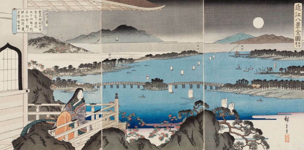 美人雖遠,隔千年亦能共嬋娟,連結實際地景,紫式部觀月成為地方名勝建構的視覺表徵。模仿宋代瀟湘八景,揀選琵琶湖周遭美景八處組成「近江八景」,在江戶時代成為一種雅致的文化而被流傳。其中「石山秋月」一景,源於平安時代法皇(出家的太上皇)行幸所見,在歌川廣重(1797–1858)的浮世繪中,藉山景分割畫面,虛實相襯空間的遼遠,皓月當空,水天一色。